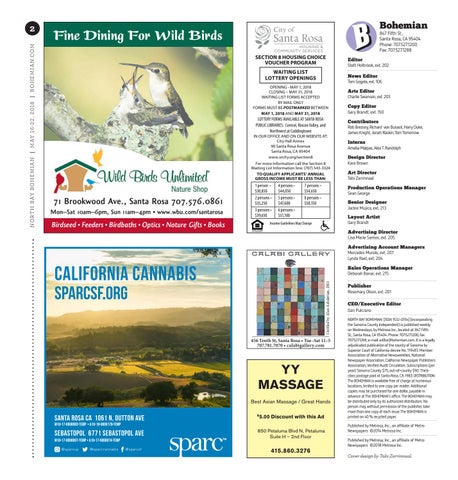 CEO/Executive Editor Dan Pulcrano NORTH BAY BOHEMIAN [ISSN 1532-0154] (incorporating the Sonoma County Independent) is published weekly, on Wednesdays, by Metrosa Inc., located at: 847 Fifth St., Santa Rosa, CA 95404. Phone: 707.527.1200; fax: 707.527.1288; e-mail: editor@bohemian.com. It is a legally adjudicated publication of the county of Sonoma by Superior Court of California decree No. 119483. Member: Association of Alternative Newsweeklies, National Newspaper Association, California Newspaper Publishers Association, Verified Audit Circulation. Subscriptions (per year): Sonoma County $75; out-of-county $90. Thirdclass postage paid at Santa Rosa, CA. FREE DISTRIBUTION: The BOHEMIAN is available free of charge at numerous locations, limited to one copy per reader. Additional copies may be purchased for one dollar, payable in advance at The BOHEMIAN’s office. The BOHEMIAN may be distributed only by its authorized distributors. No person may, without permission of the publisher, take more than one copy of each issue.The BOHEMIAN is printed on 40 % recycled paper.
