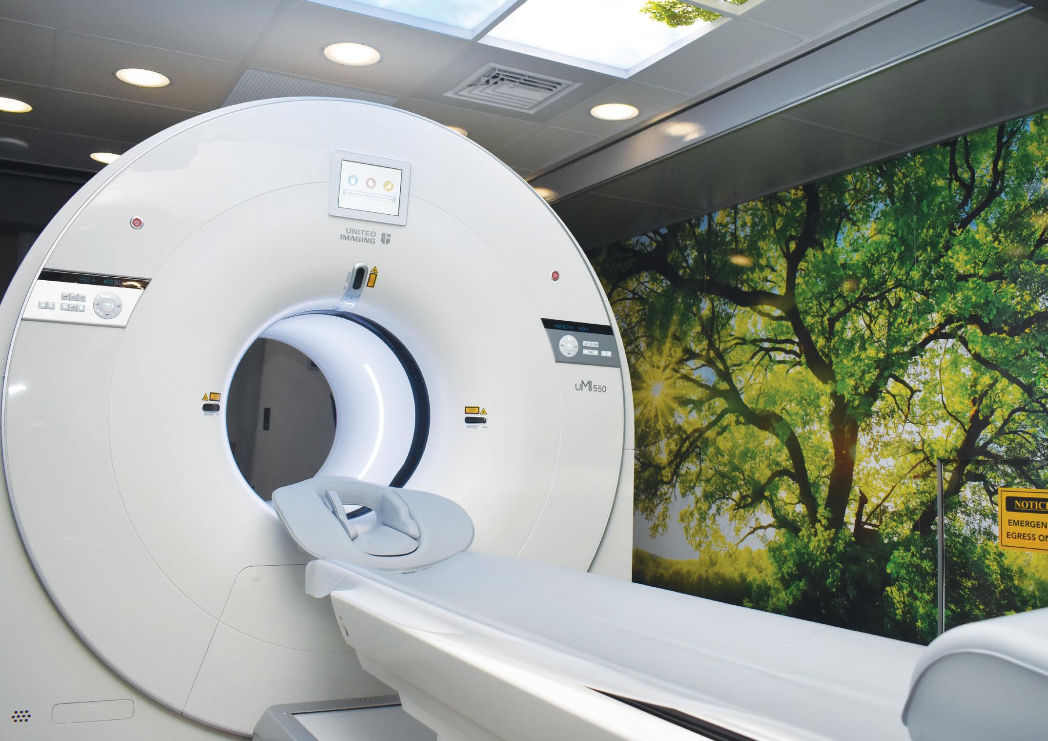 “We try to create a calm place,” he adds with a smile. With a skylight over the imaging table, and nature murals on the walls, patients can visualize the outdoors during the test.