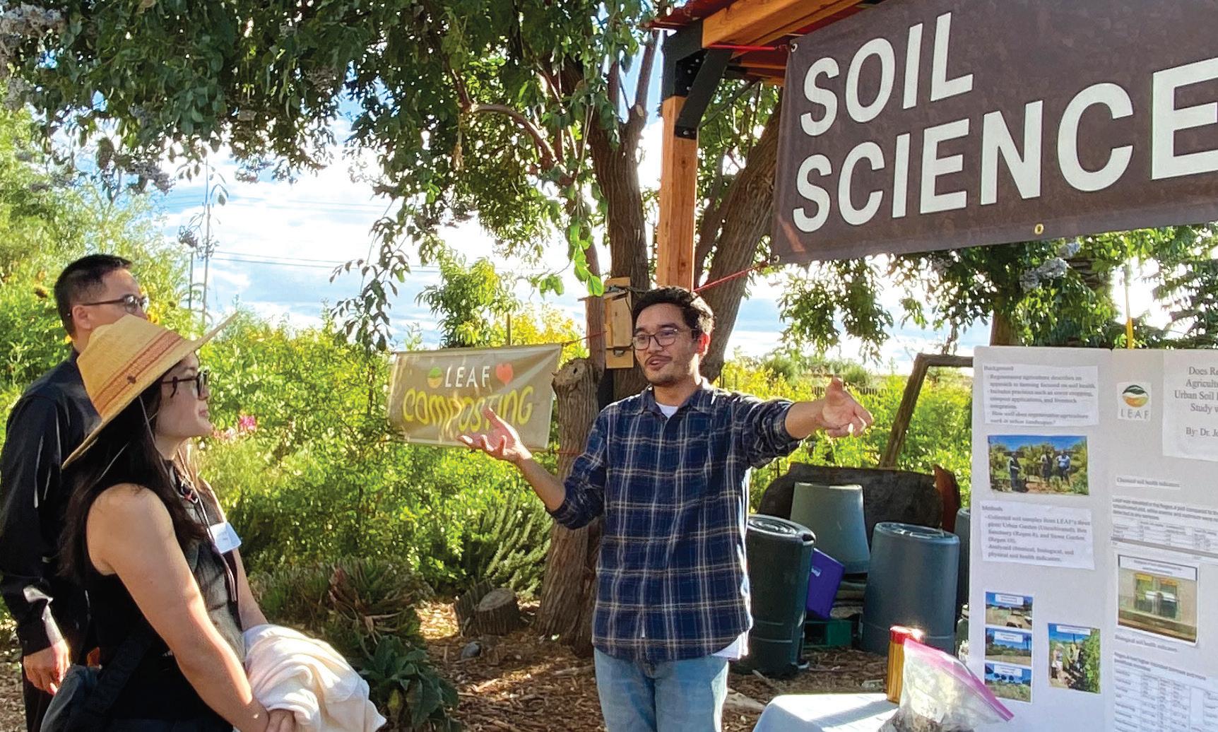 denly opens up into a garden with raised planters, greenhouses, vegetable beds and beehives. Colorful murals painted by local students compete with the flowers to add vibrancy and cheer. The scents of mulch and compost permeate the air,