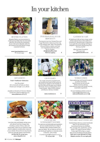 CRISP CAFE Low Carb, Keto and Diabetic all day menu and cabinet food that changes daily including a variety of slices, cakes and cheesecakes. Check out our extensive range which is added to monthly either instore or on our website. We are the one stop shop for all of your specialty dietary requirements. 376 Ilam Rd, Ph: 03 351 4414 www.crispcafe.co.nz 72 14 October, 2021 Metropol