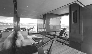 Các tiện nghi trên tàu cũng rất đa dạng, nhưngđiểmnổibậtnhấtchắcchắnlàphần boong được thiết kế để trở thành không gianlinhhoạtnhấttrêntàu.Nócũngcómột bểbơivớimáytạosóngngượcdònglớnvới chânđếbằngsợicarbonvàtườngkính,một quầy bar có thể chuyển đổi thành sàn mix nhạc cho DJ, cùng với đó là nhiều không gianphòngchờđủloạicảngoàitrờilẫnbên trongtàu. Ởmộtvàikhuvực,cácthànhphầncủacon tàu có thể mở rộng bằng cách mở ngang hoặcgậpra.Bằngcáchnày,tùythuộcvào những gì khách muốn làm tại bất kỳ thời điểmnào,họcóthểởngoàinắng,ởtrênmặt nước hoặc ở trong nhà, nhưng vẫn cảm