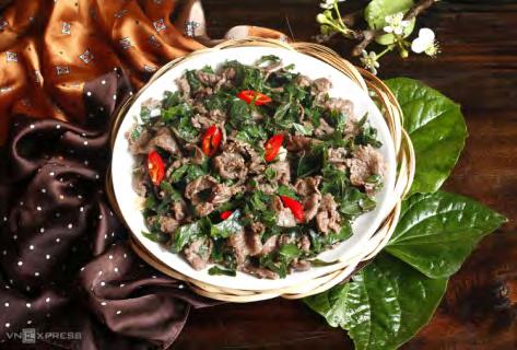 Thịt bò đem thái lát mỏng theo thớ ngang, tẩmướpchútgiavịrồixàototrênlửalớn,khi thịtchíntớicholálốttháinhỏvàođảoquavài