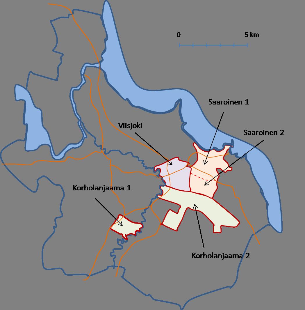 Korholanjaaman,SaaroistenjaViisjoenkylien ydinalueet1880-luvullaisojaonjälkeen.Kylille kuuluinäidenalueidenlisäksimetsäalueita sekäranta-alueitaLaatokanrannastajaTaipaleenjokeareunustavaltaSuvannonlietteeltä.