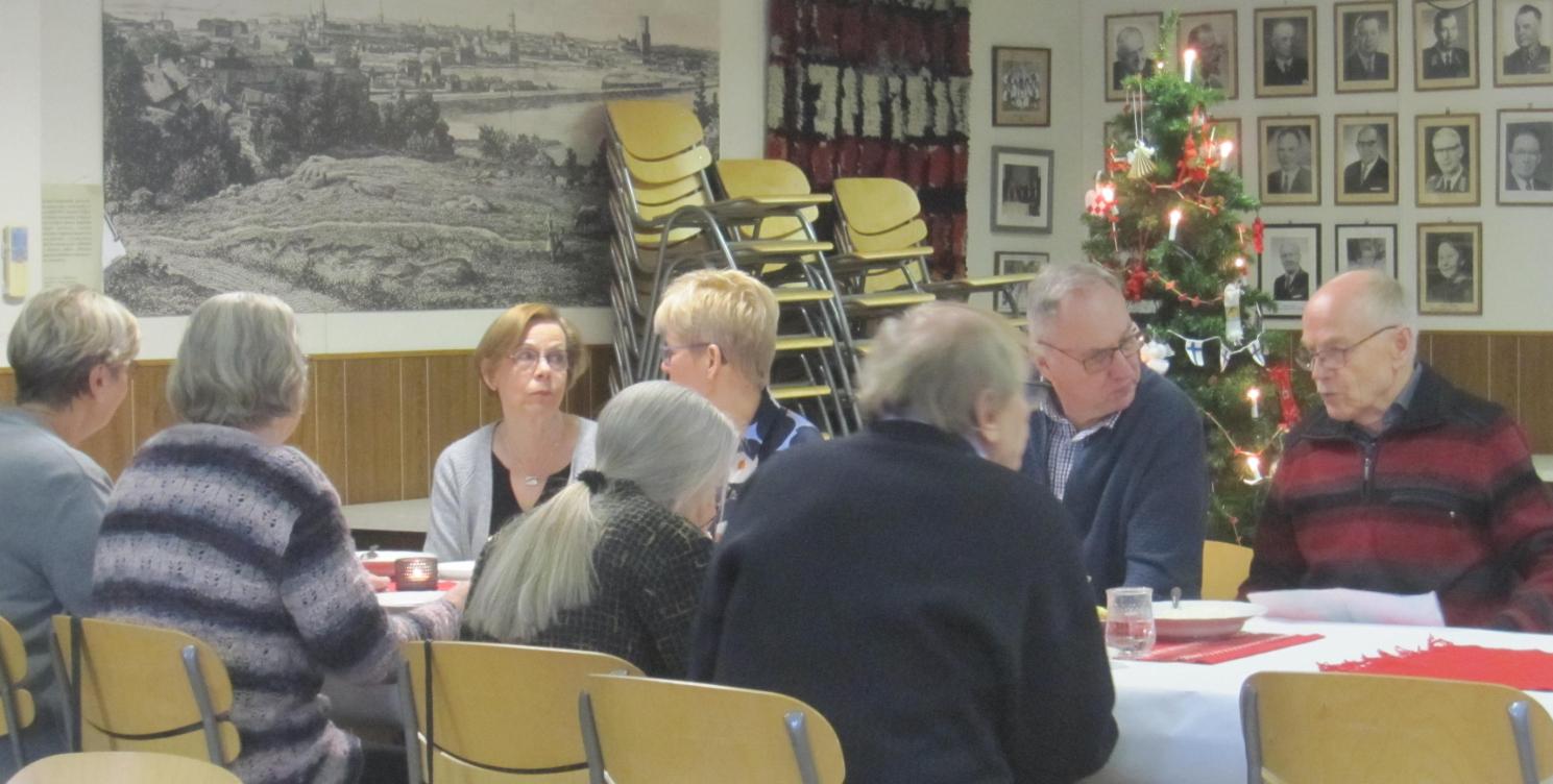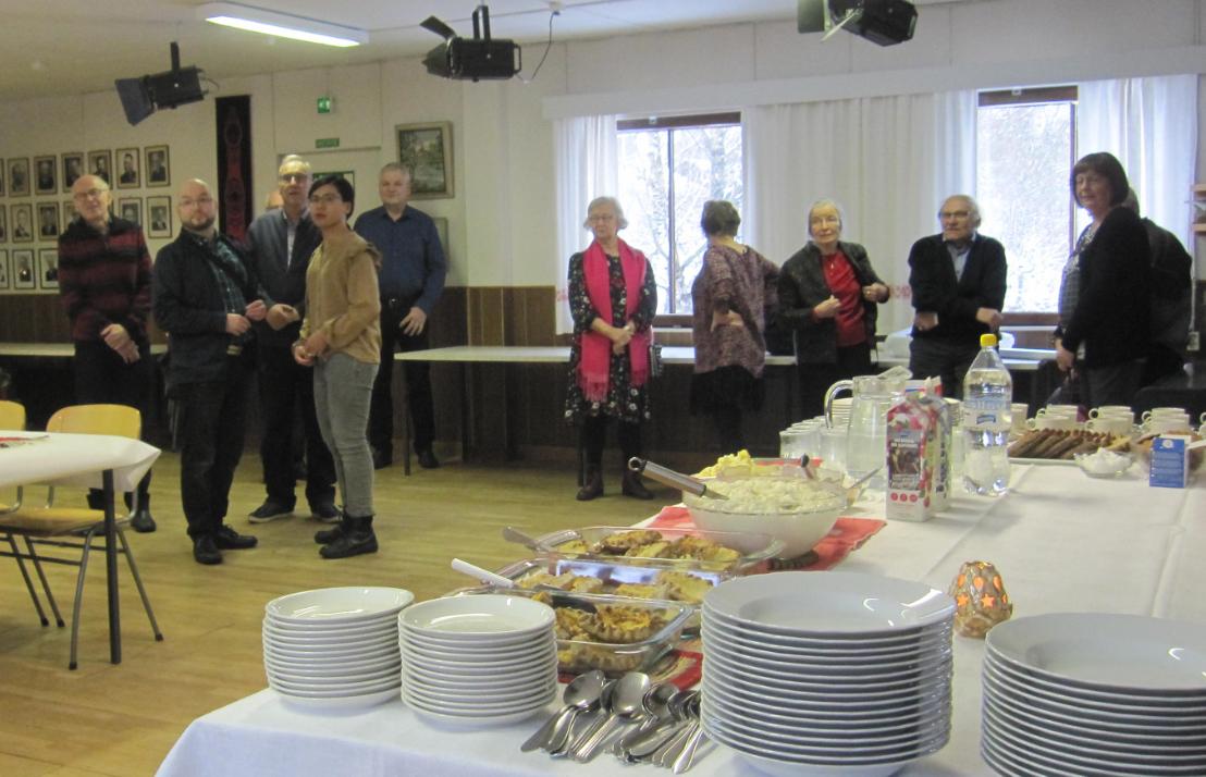 Yhteenkokoontuminenonjuhlaa,kuntakanaonrajoitustenvuosia. Kaikkiaan23henkeäsaapuimarraskuunlopussaTurunKarjalaistentalollejoulupuuronmerkeissä.