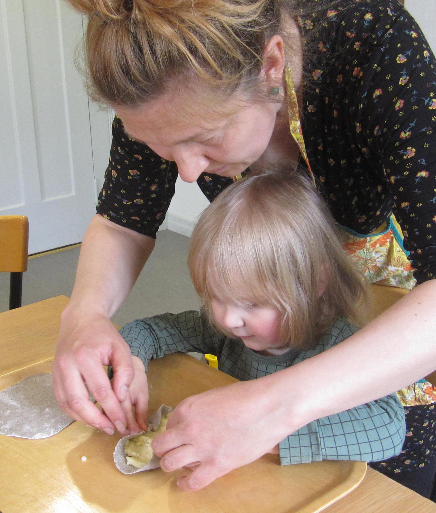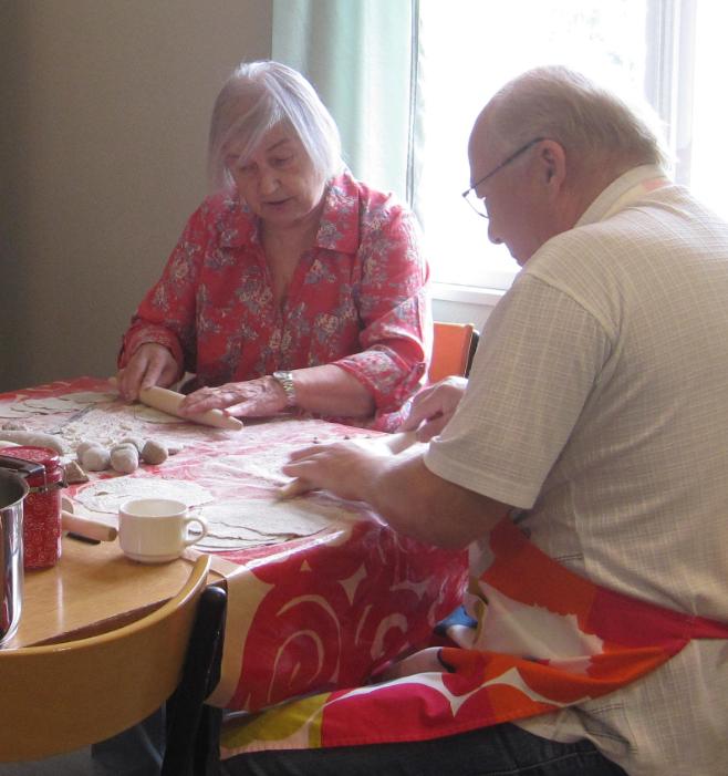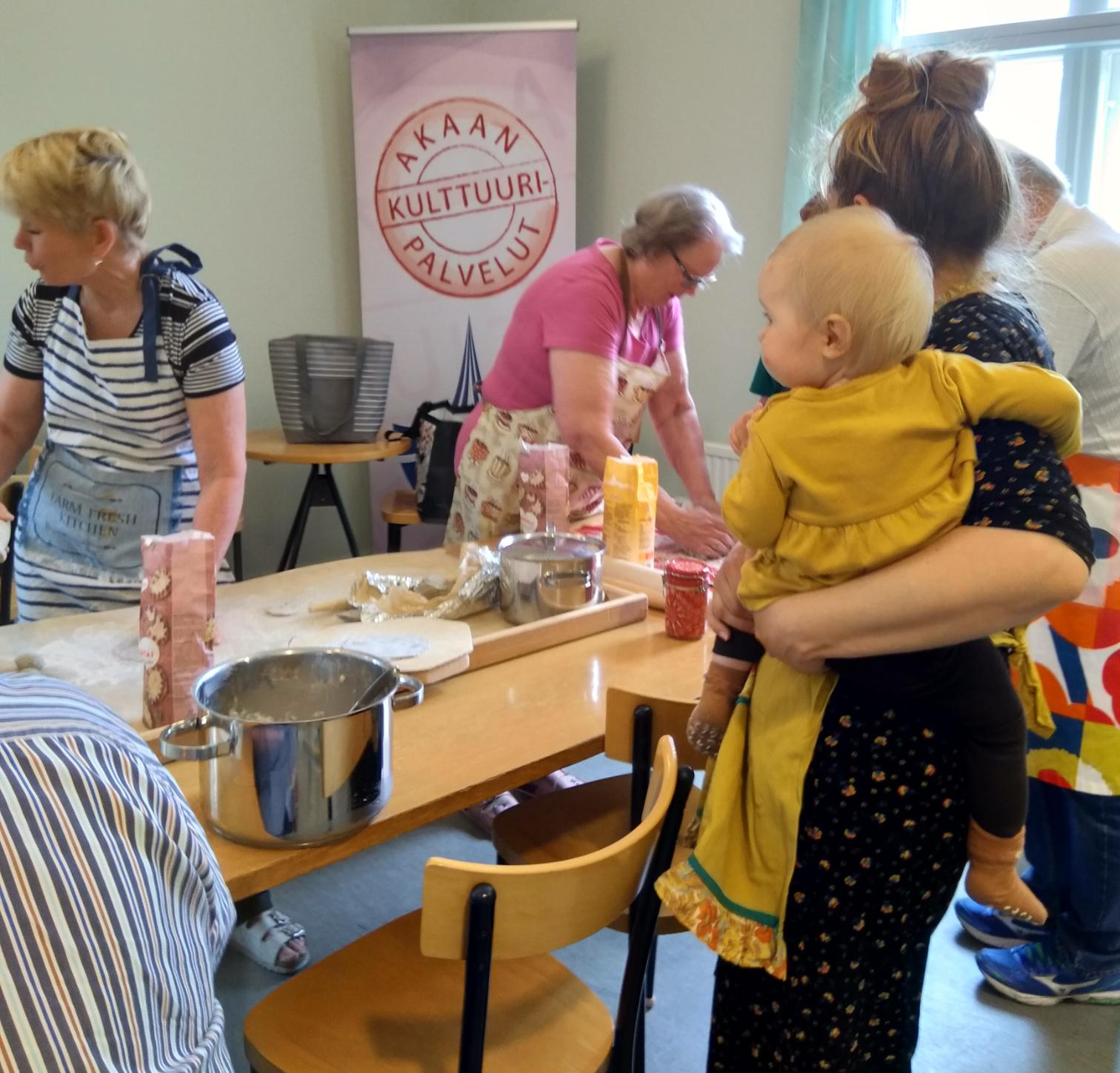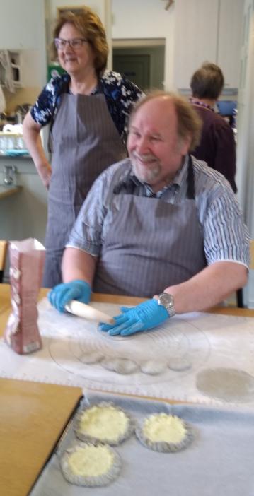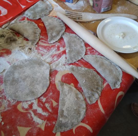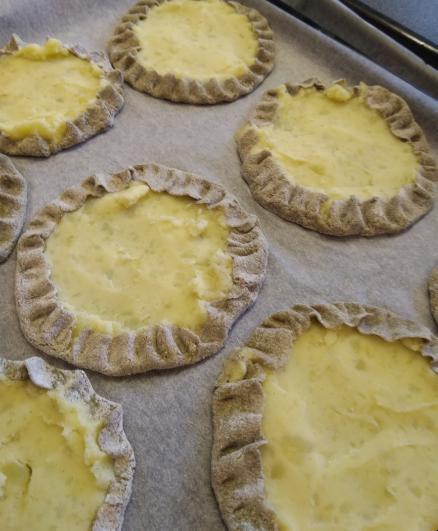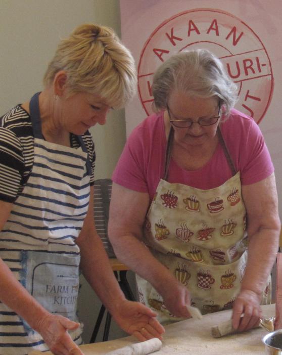 Piirakantekijäkonkaritjaaloittelijat yhdessätekivättaikinaa,opeteltiin rypytyksensalojajatäytettiinpiirakoita.Riisi-,hirssi-jaohrapiirakoitavalmistui.Tietystimyösperunakakkaroita.Yllätyksenäsaimme paistostenpäällämaistellaHarri