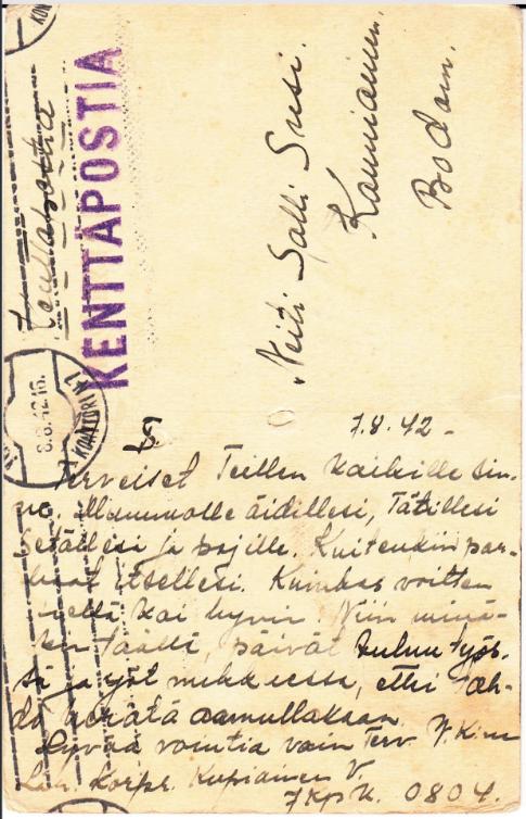 SalliRastasonsäilyttänytarvokkaitamuistoja lapsuudestaan.TämänKenttäpostia-kortinhänon saanutseitsemänvuotiaanakesällä1942.Sallin perheasuituolloinevakossaEspoossaBodomin kartanossa.KortinlähettäjäonVeikkoKupiainen,joka työskentelirauhanaikanakartanonkarjakkona.-Salli muisteliettäVeikkooliensimmäinenhenkilö,jonka heidänperheensätapasiBodomiintulomatkallaan.
