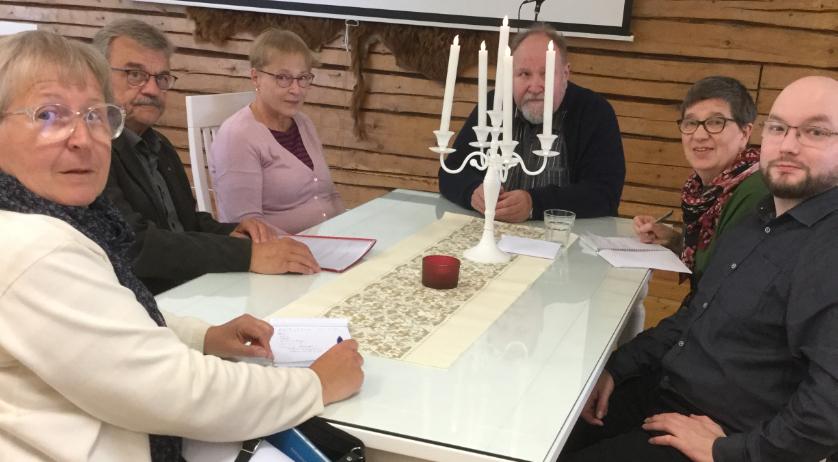 AhtiaistensuvunHämäläis-haaraajahiukanmuitakinsamanpöydän ääressähaastelemassa.