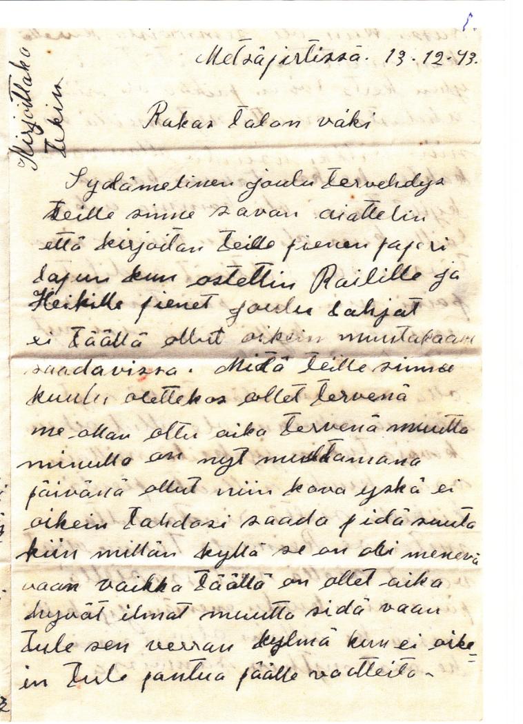 SalliRastas(os.Susi)jahänenlapsuudenperheensätulivatensimmäiseen evakkopaikkaansaKangaslammenpitäjään,Räisäsenperheeseen,joulu‐kuussa1939.Salliolituolloin4-vuotias.SallinTahvo-setäjavaimonsaIda (os.Ahtiainen)palasivatjatkosodanaikanaMetsäpirttiin,sieltäIdakir‐joittaaRäisäsenperheelle.KirjeessämainitutRailijaHeikkiovatRäisäs‐tenlapsia.SallijaRäisästentytärRailiovatedelleenkirjeyhteydessä!