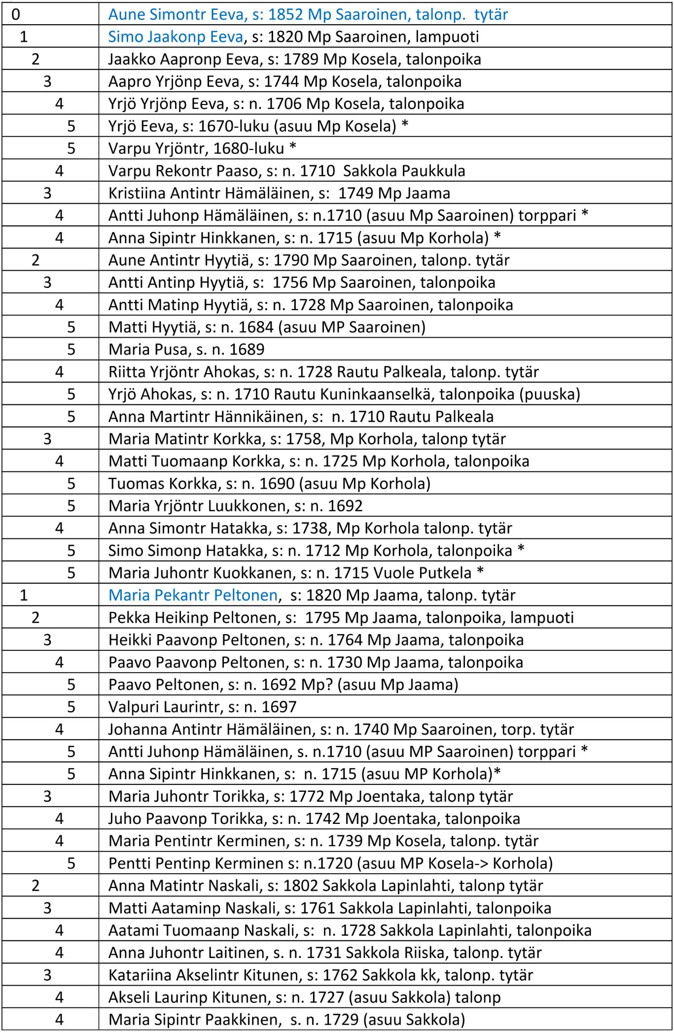 Taulukko1:MattiTuomaanpoikaAhtiaisenesivanhemmatisänpuolelta. SinisellämerkitytlöytyvätAhtiaistensukukirjasta.*:llämerkitytesiintyvättaulukoissauseampaankertaan.