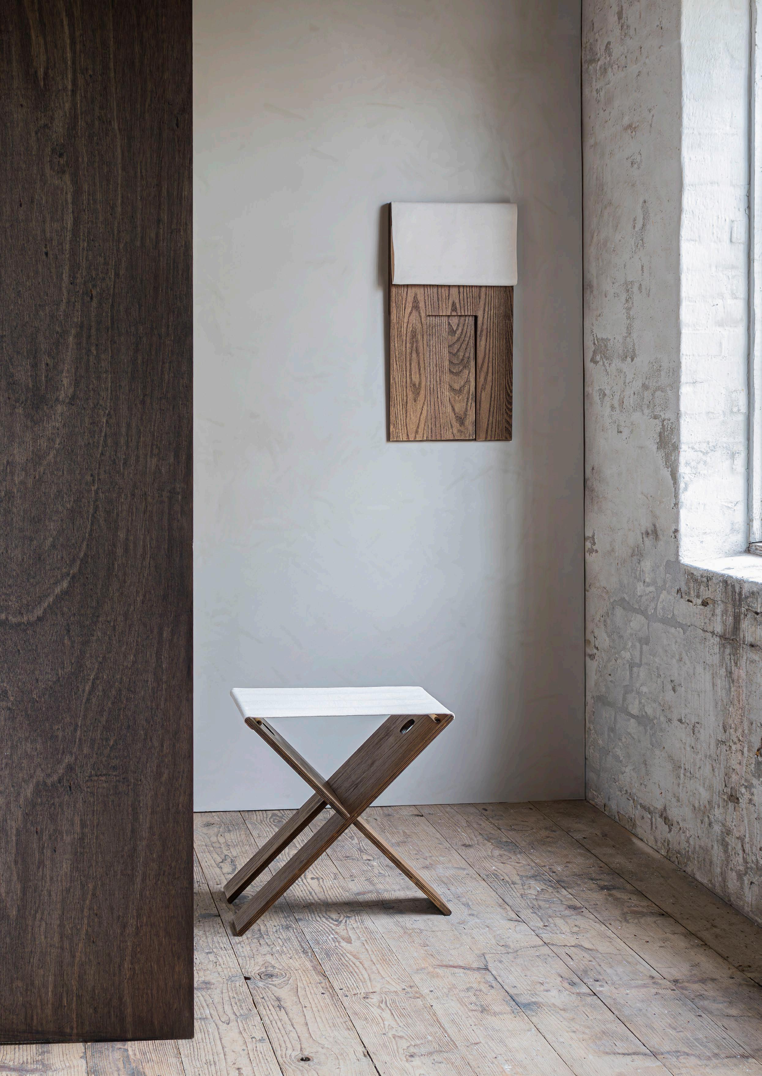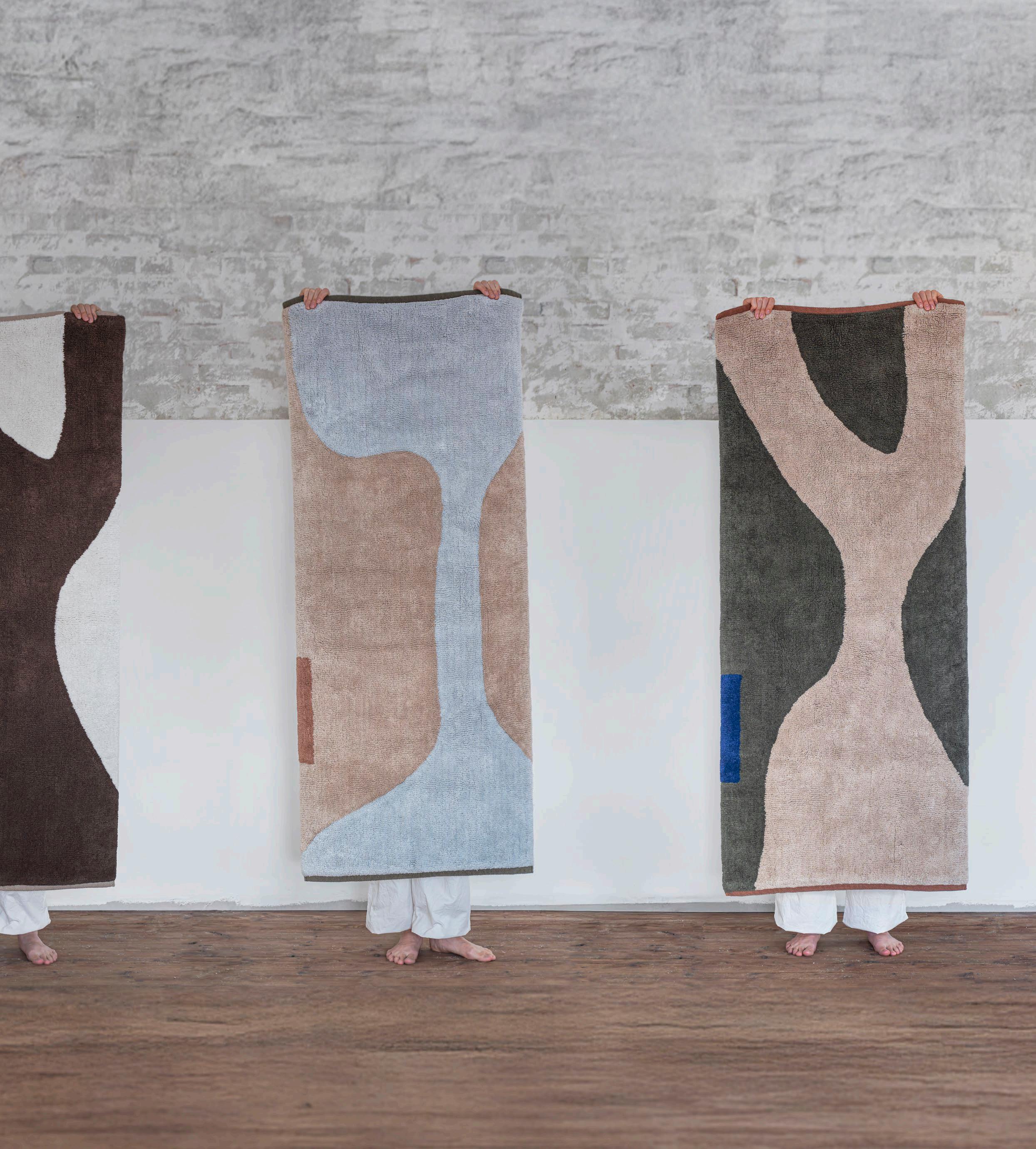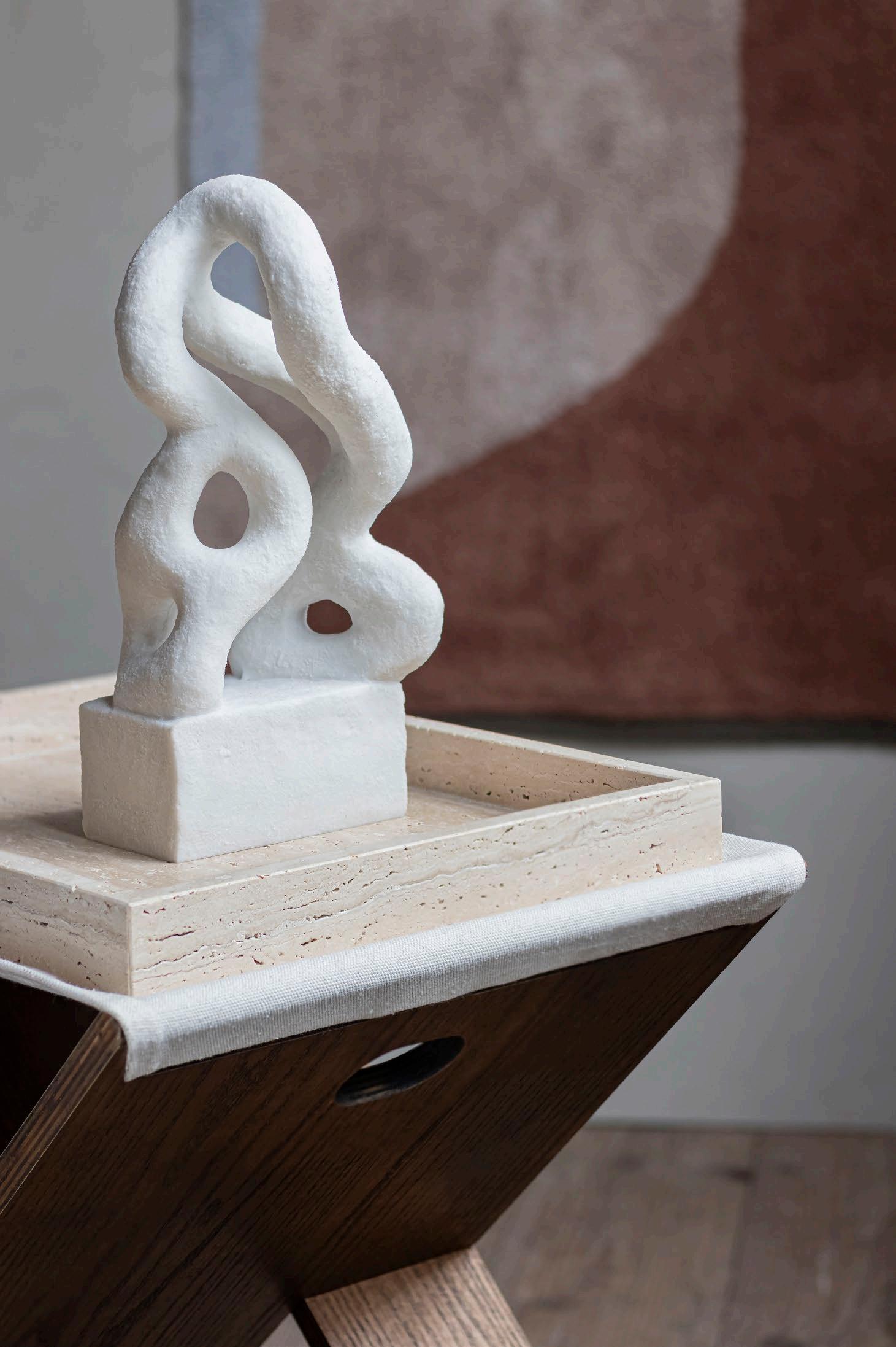 ART PIECE symbiosis sculpture, TRAVERTINE tray, ROOTS folding stool, FIGURA rug