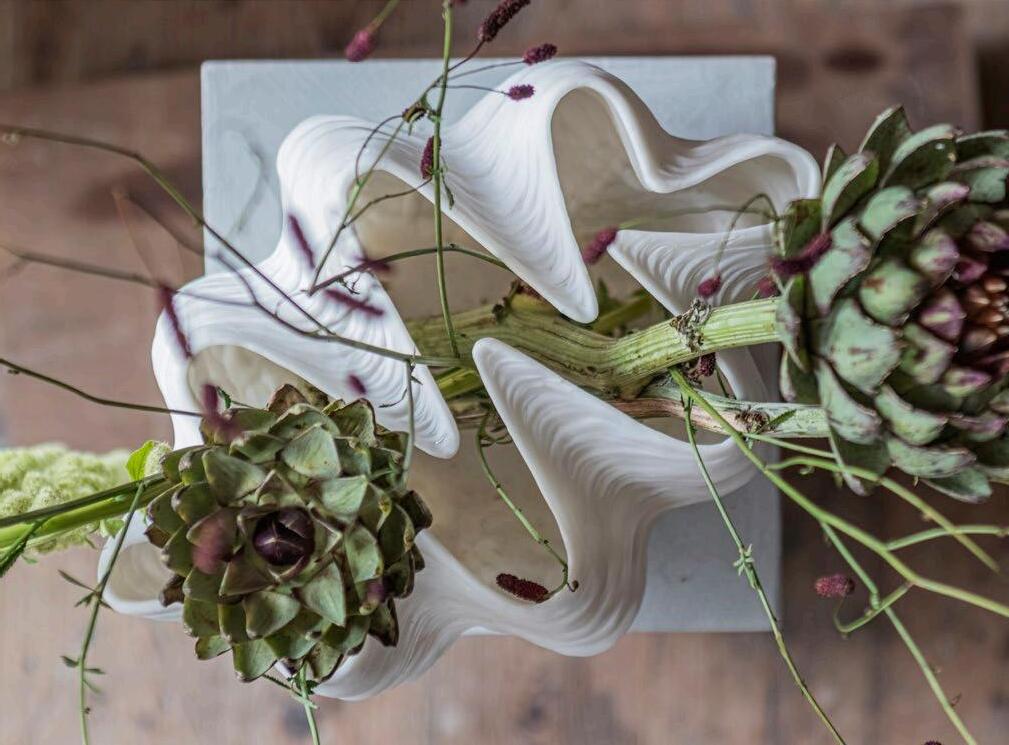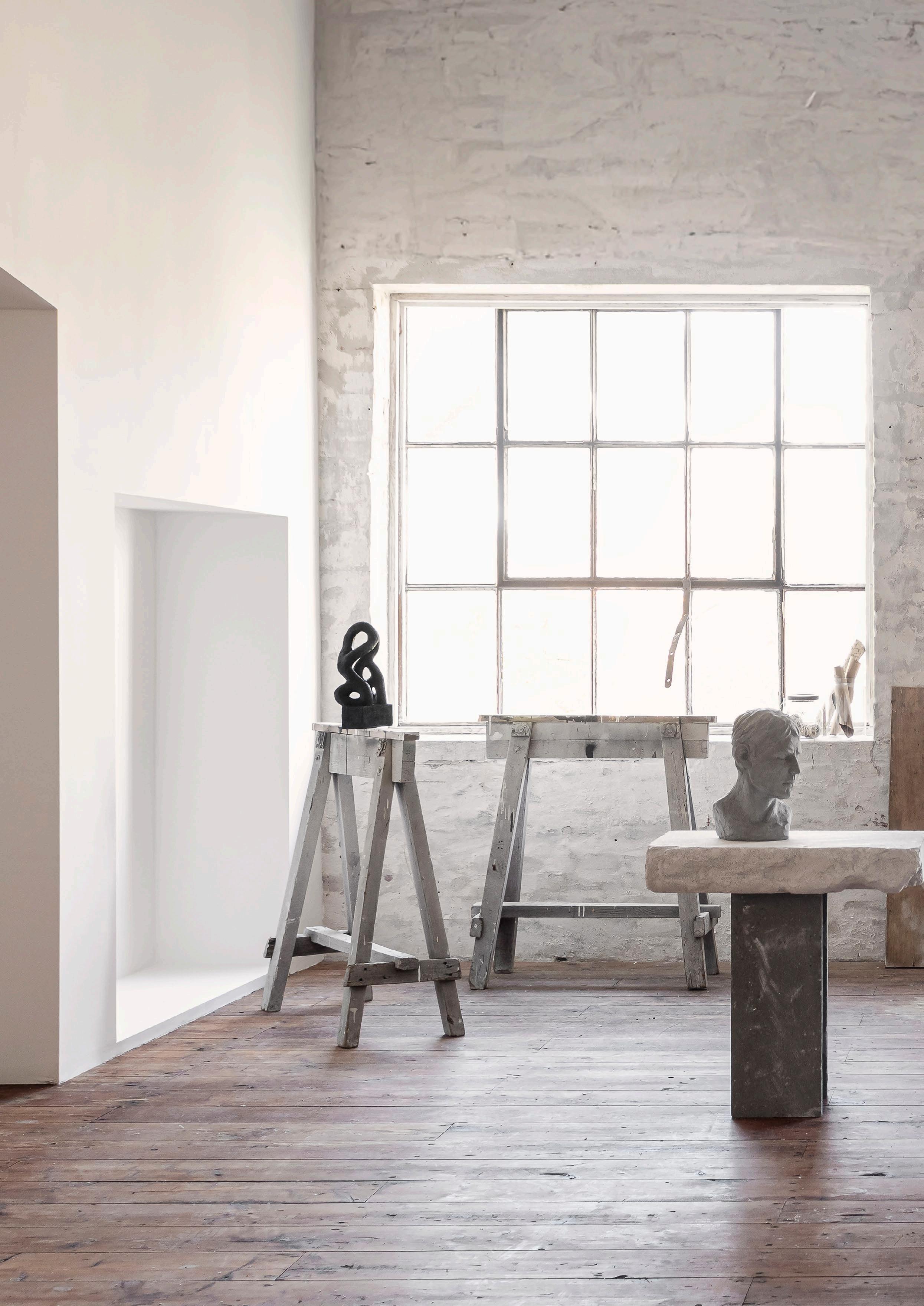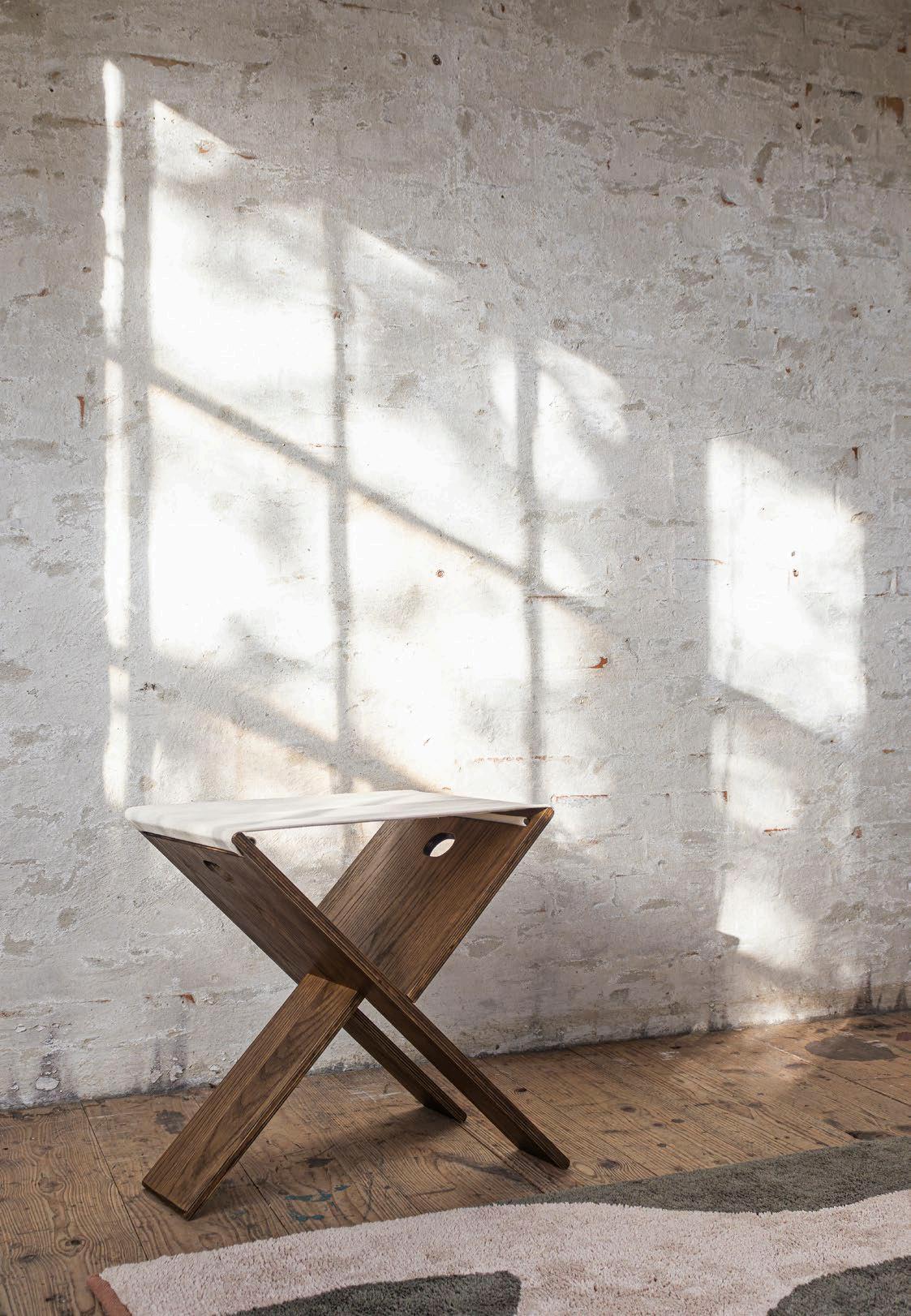 ART PIECE symbiosis sculpture, TRAVERTINE tray, ROOTS folding stool, FIGURA rug
