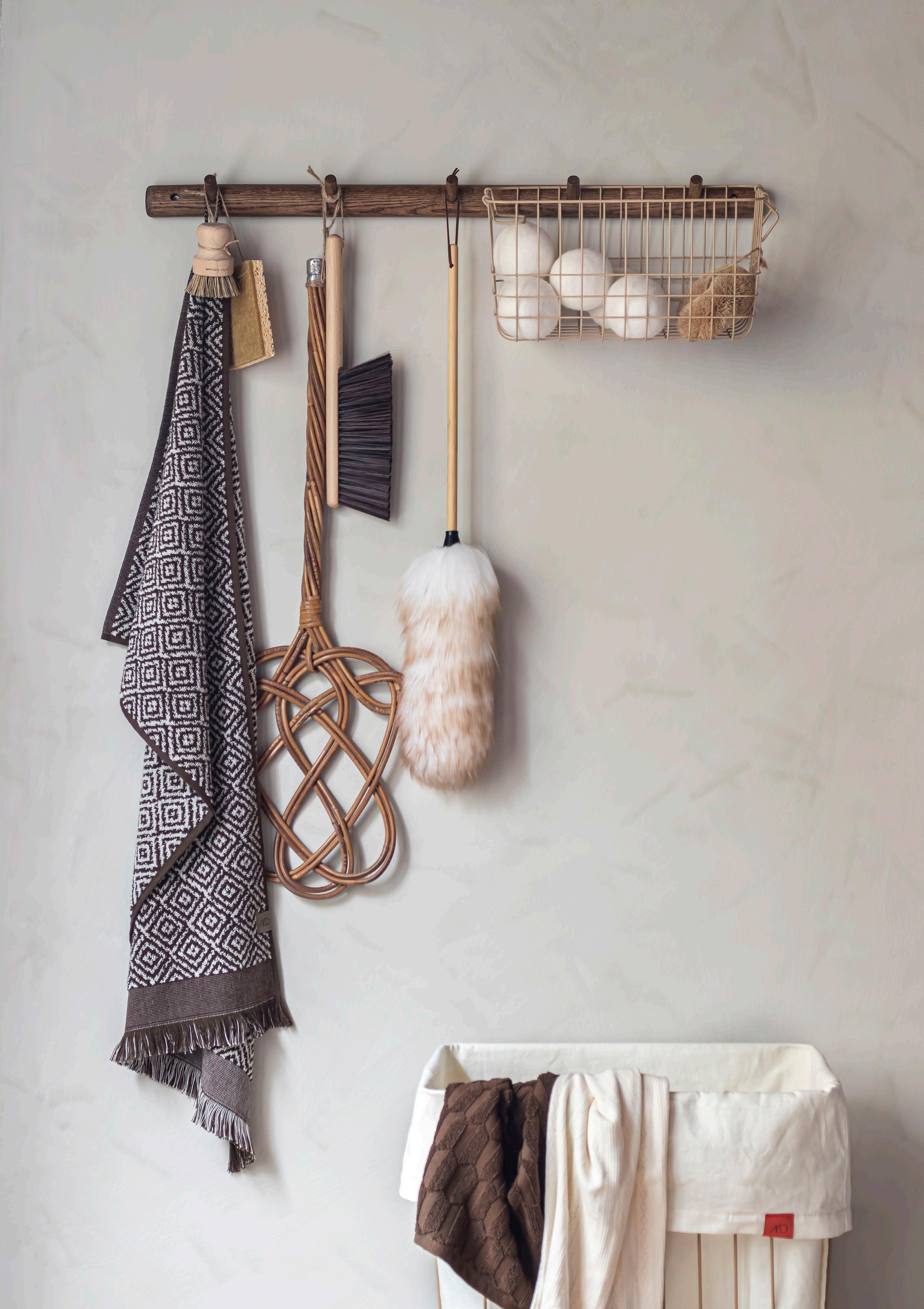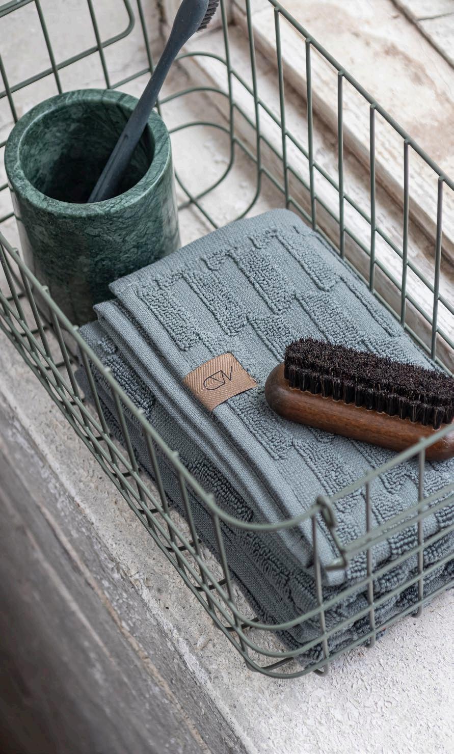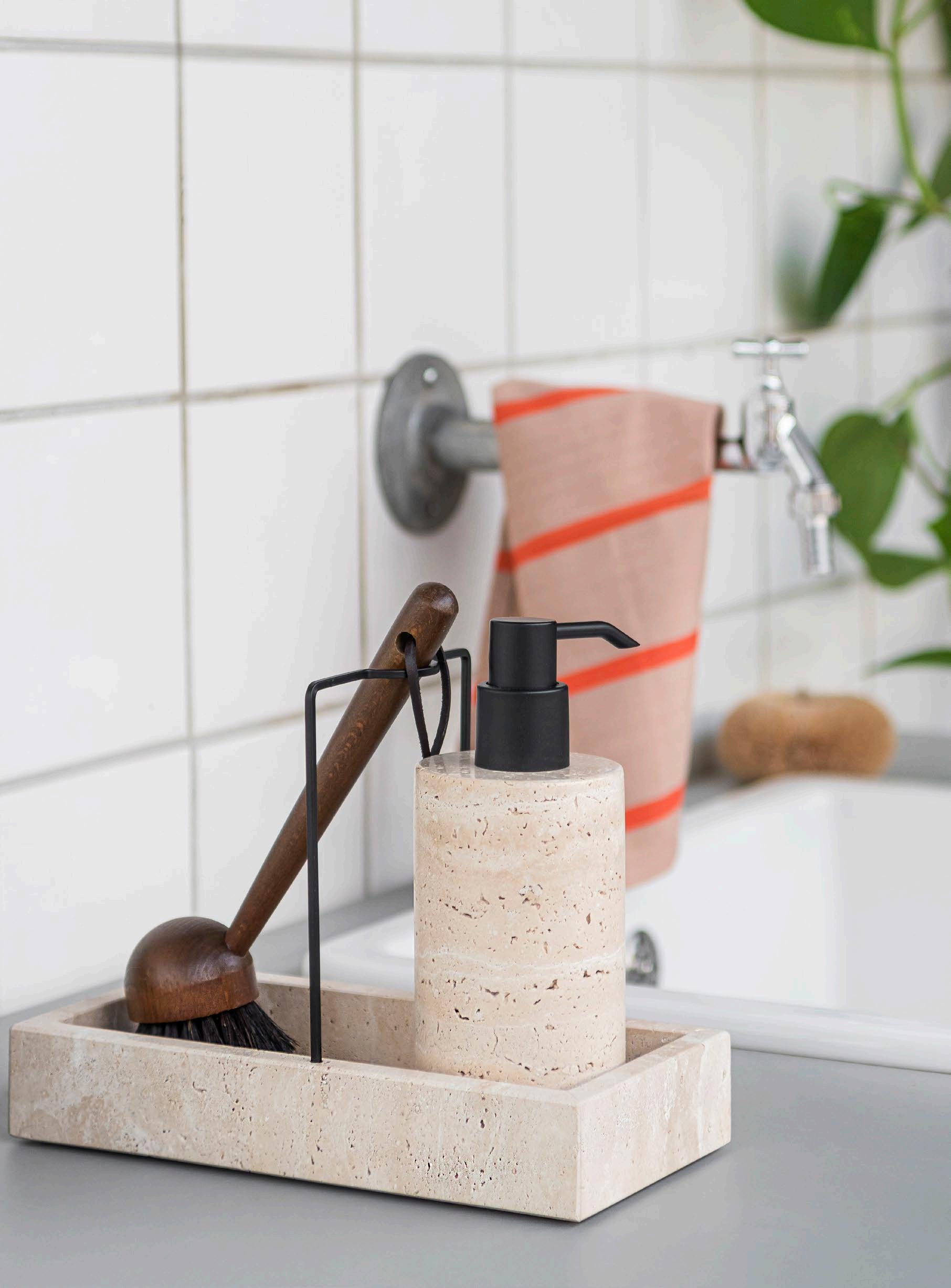 TRAVERTINE dish wash organizer and dispenser, STRIPES dish cloth and tea towels, STORE-IT baskets, HANG-IT S-hooks