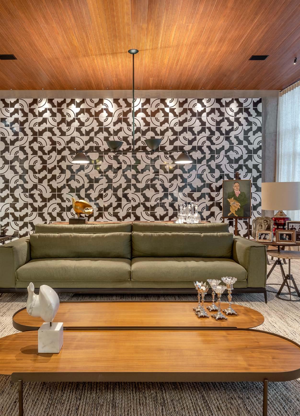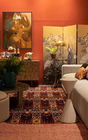 Este ambiente assinado pelo designer de interiores Carlos Reichmann encanta pela riqueza de detalhes. Pensado para um colecionador de tapetes, o espaço é todo revestido em tapeçaria feita à mão. As formas, cores e texturas das peças dão destaque às obras de arte e peças de design. O mobiliário Century completa a composição, tornando o local perfeito para contemplar a vida cotidiana com mais vivacidade.