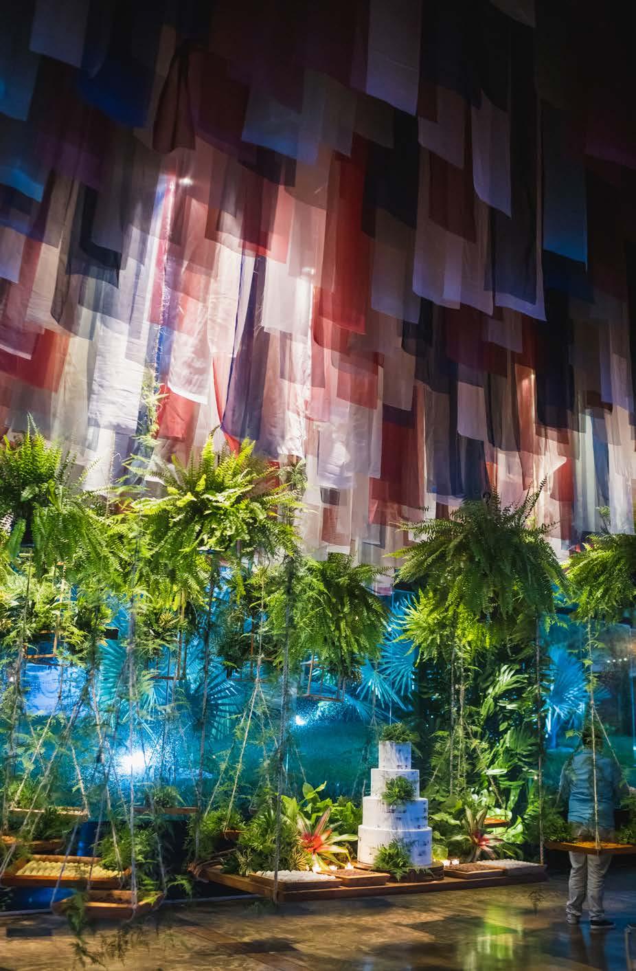 Todo o ambiente foi abraçado por painéis de Madeira Tauari que, junto da cor verde e das pedras naturais presentes nos revestimentos, trazem o conforto visual da natureza em toda a composição. O toque de ousadia e personalidade ficou por conta do tom azul marinho que, junto com o verde, representa uma combinação totalmente inusitada para os estofados Century, mas que conferiu identidade e sofisticação ao espaço.