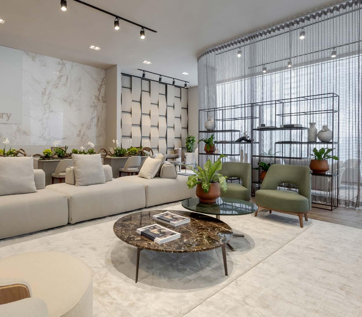 This environment signed by interior designer Deborah Nicolau composes the showcase of the Villa Batel store in Curitiba. The space is an invitation to receive well, excelling in elegance and functionality. With a lot of contemporaneity, the beauty of the curves and the plurality of textures make the composition extremely attractive to the eye. The movement of shapes and colors create a light but striking atmosphere in every detail. The Century furniture in green tones refers to nature and summer, with pieces that convey freshness and naturalness.