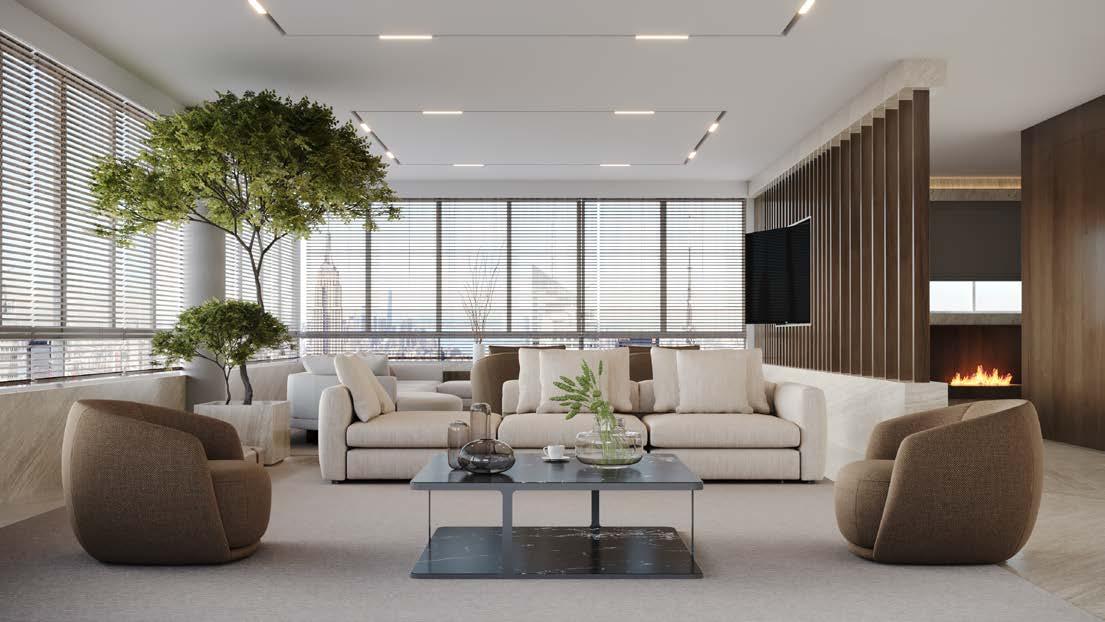 With a focus on leisure and relaxation, this environment signed by Gustavo Scaramella conveys lightness, without giving up elegance and personality. The architect created a layout that allows for various configurations, enhancing the user’s interaction with the Century furniture. The armchairs and pouffes, positioned facing the sofas, form a beautiful composition of right angles, curved and angled. All this framed by a predominantly cool color palette, which is a true invitation to rest.