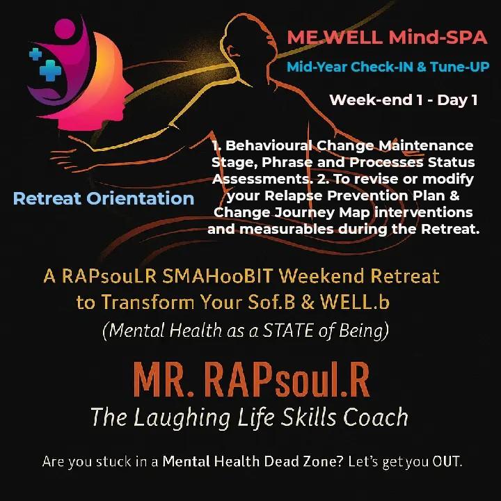 "Welcome to the ME.WELL Mind-SPA Sof.B & WELL.b exPE Retreat Series. I’m your guide and Tele-Edu SMAHoody Life Skills Coach, Mr. RAPsoul.R – The Laughing Drama.Narrative.Play Life Skills coach.