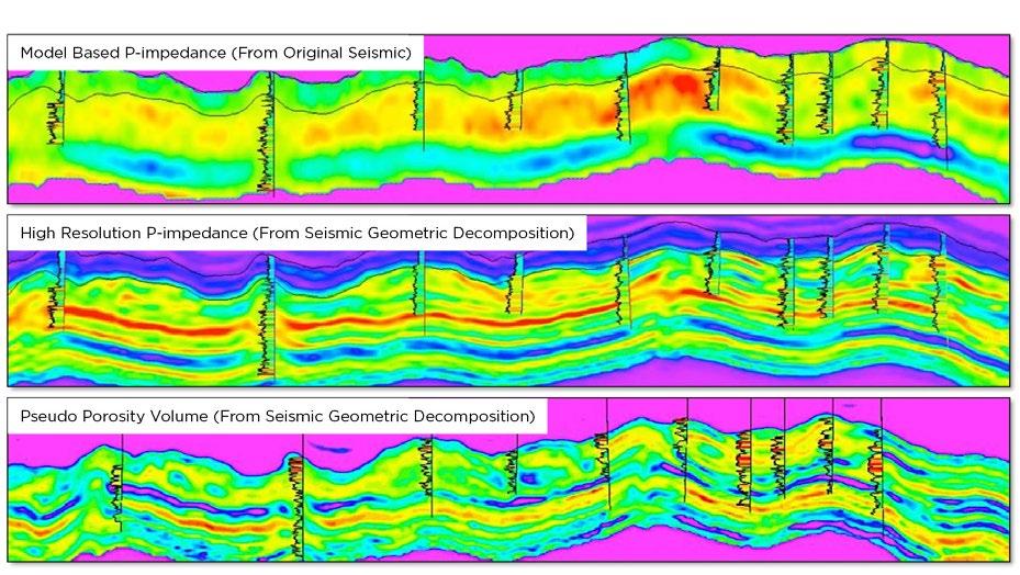 that contribute the most to resolve the vertical variations observed in the P-impedance log. The result is a seismic vintage that increases the vertical resolution of the input seismic (PCE versions are used in general) by honoring its native phase. Again, the main original onsets are preserved by the process, meaning that prior surface interpretations might be used.