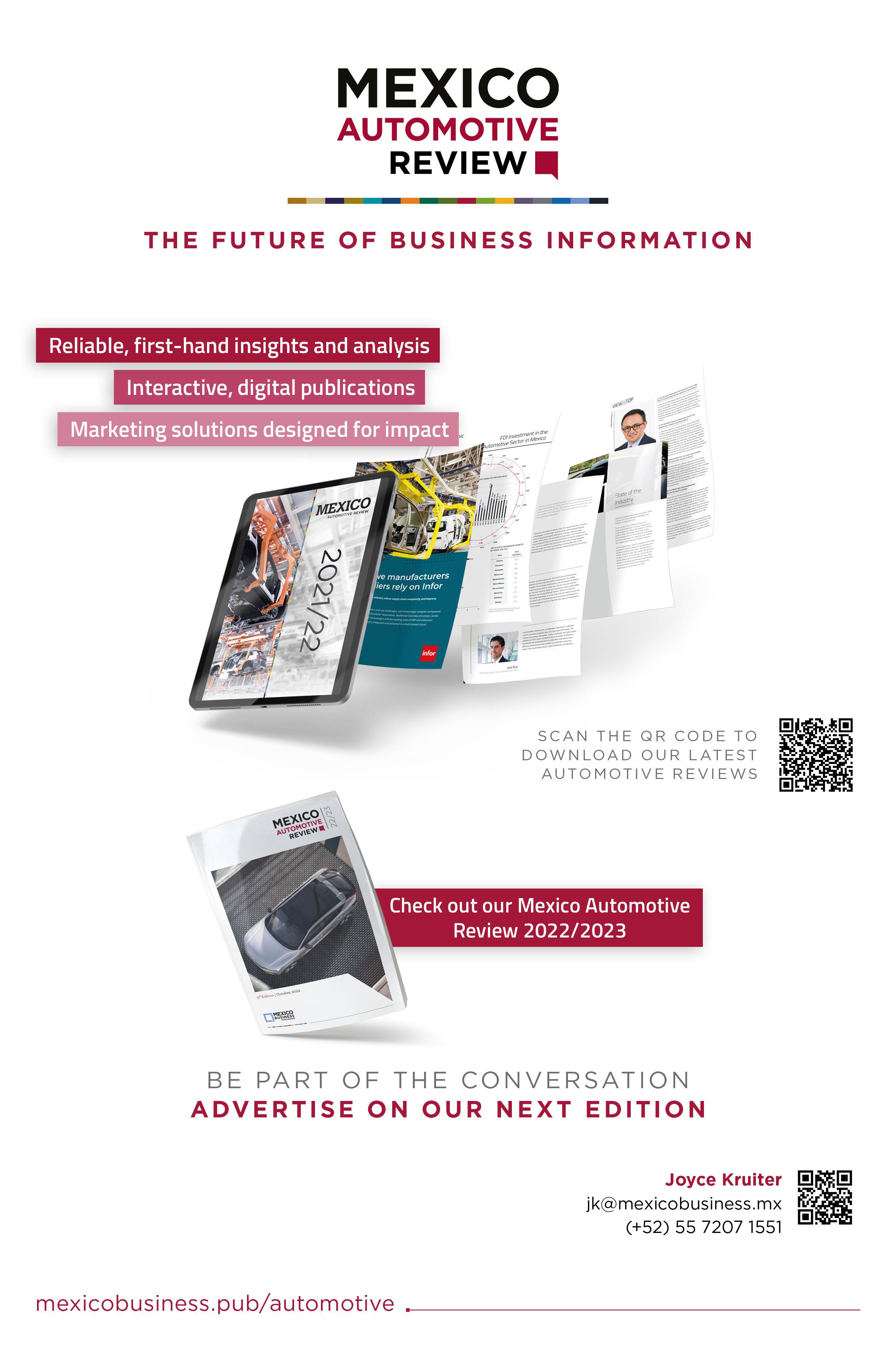 © Mexico Business Publications S.A. de C.V., 2022. This annual publication contains material protected under International, US and Mexican Laws, as well as international treaties. Any unauthorized reprint or use of this material is prohibited. No part of this book may be reproduced or transmitted in any form or by any means, electronic or mechanical, including photocopying, recording or by any information storage and retrieval system without express written permission from Mexico Business Publications S.A. de C.V. Mexico Automotive Review is a registered trademark.