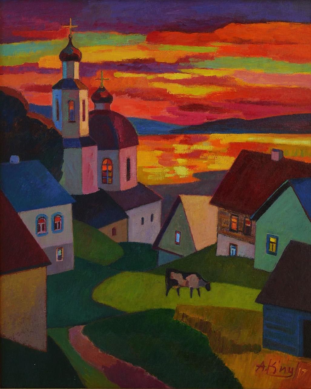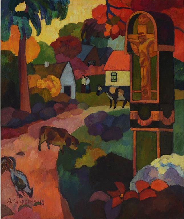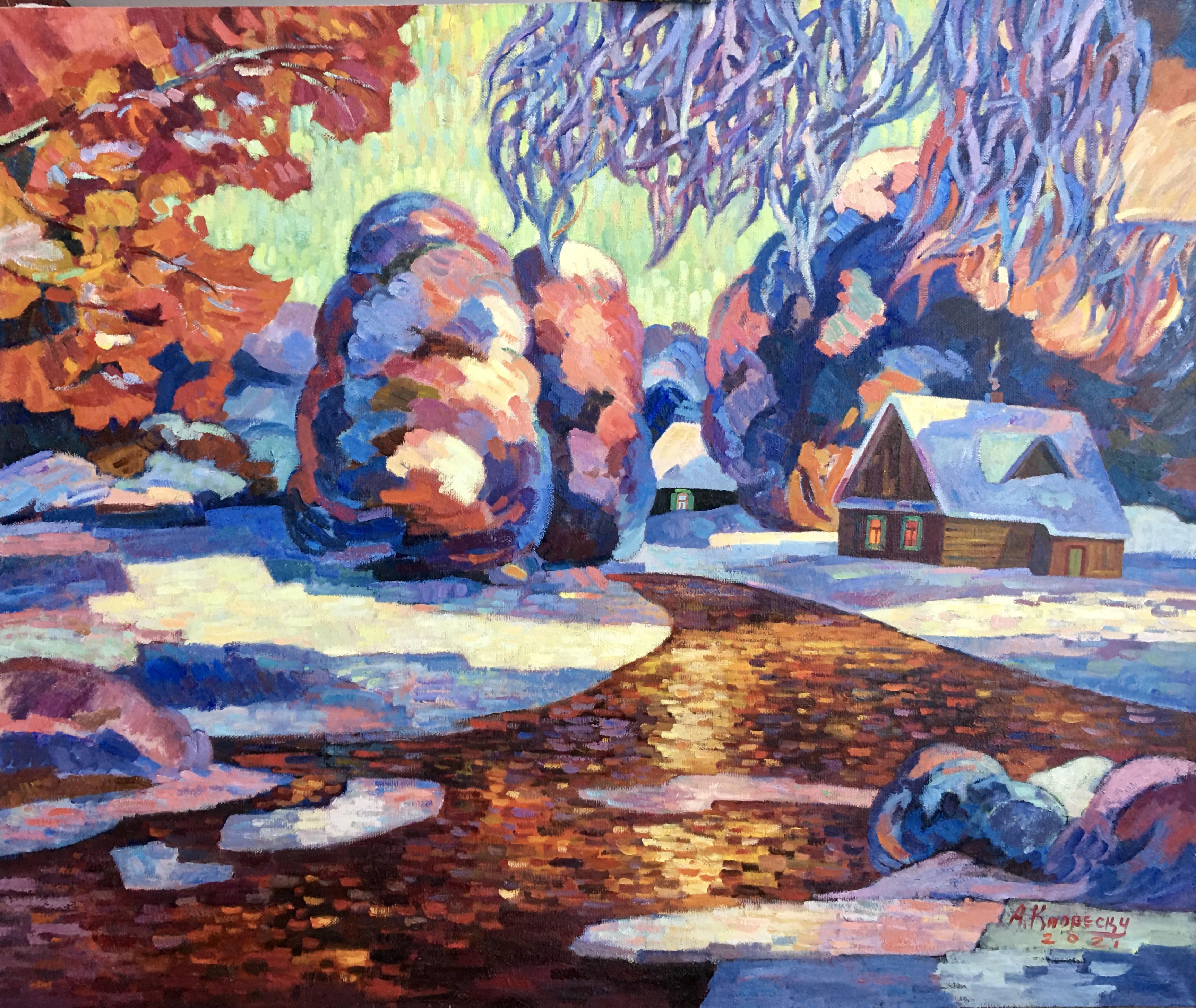 Andrei’s education and upbringing in St. Petersburg had a significant impact on his artistic style. The 1980s, a period of political upheaval and rapidly growing capitalism, was a significant cultural backdrop for the artist. Socialist realism was the dominant art movement in the Soviet Union during the period of 1932 to 1988 and was later adopted in other socialist nations after World War II. The style is defined by its focus on depicting the communist ideology and values. Around the time of the dissolution of the USSR, Kioresku was drawn to post-impressionism, with rich color palettes, naturalistic forms and primitive subject matter. He combines the emotion of Levitan and the language of Gauguin with his own imagination to create his beautiful Russian landscapes.