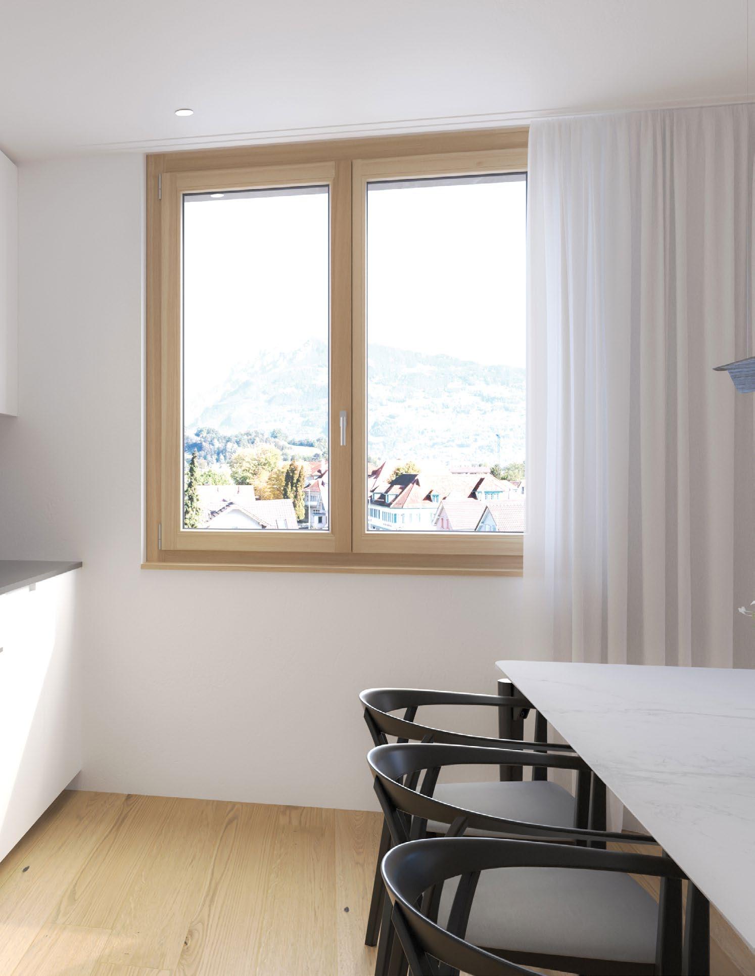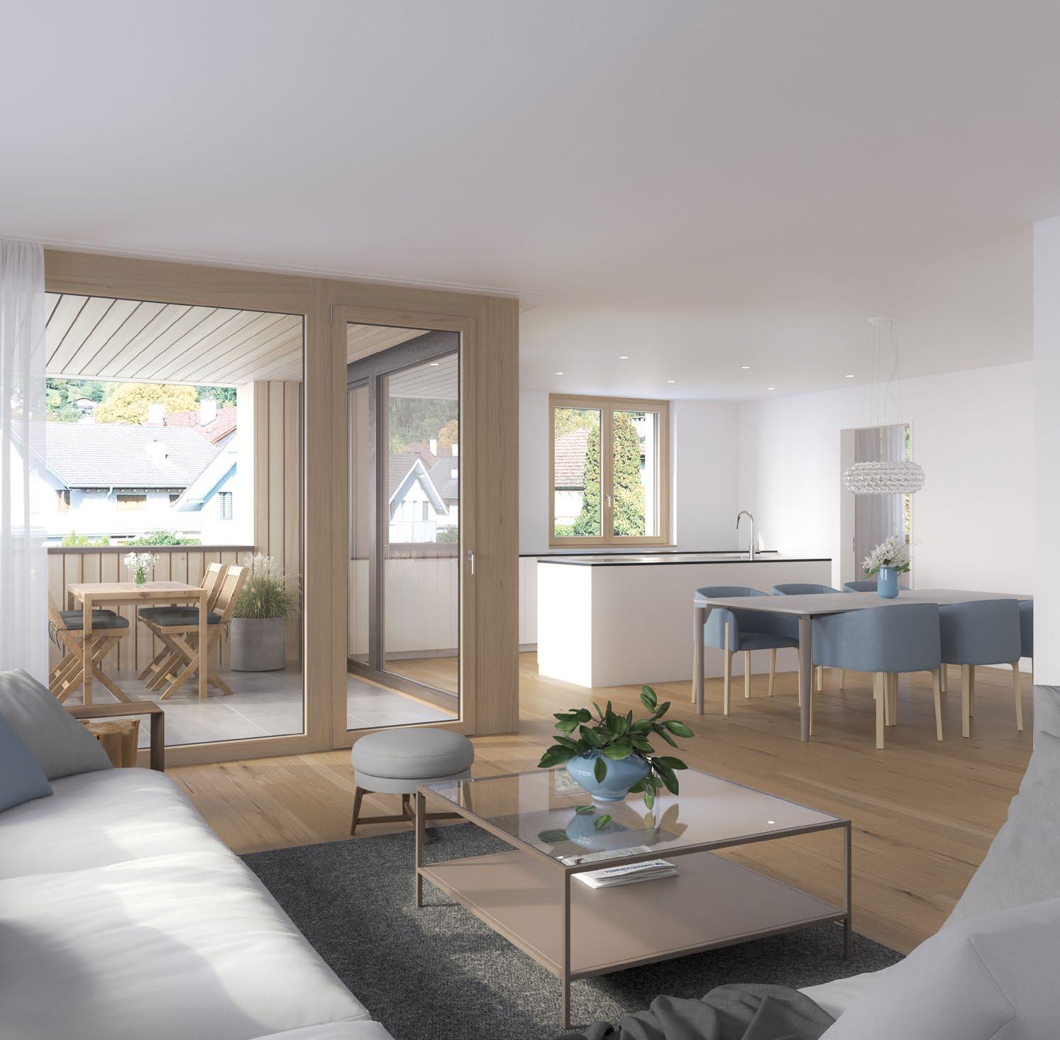 Die hellen Wohnungen beeindrucken durch klare Linien und eine harmonische Integration der Holzelemente. In den lichtdurchfluteten Zimmern mit Eichenparkett und Fussbodenheizung fühlen Sie sich sofort wohl.