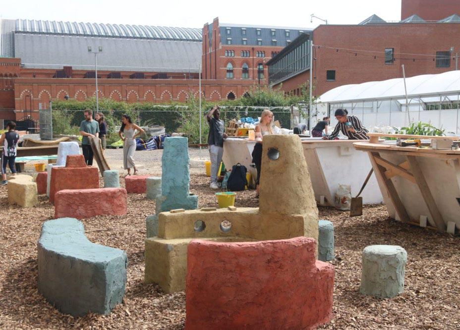 Hybrid structures for the community built using sand, fibres, fabric and plaster
