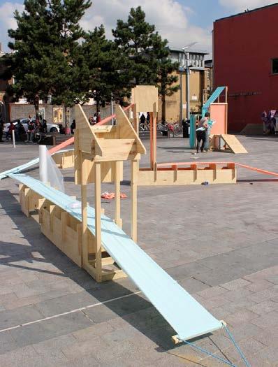 A design and construction of an open-air stage, bespoke to the script, performer’s requirements and the complex dynamics of the square. The encircled stage enables an interactive and complex relationship between the performer and the viewer. Two weeks of construction were carried out in full view of the public, allowing continual testing of the space and its components.