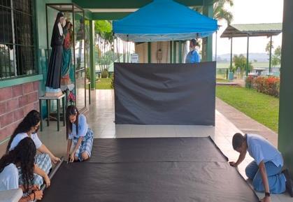 Nos dieron permiso para utilizar el área de los casillerospara trabajaren la estructura de nuestro stand, el cual será un cuarto oscuro. La profe Mireya finalmente nos confirmó el lugar donde estaríamos el día de la feria y la profe Maryan vino y superviso nuestro trabajo. Todos estuvimos presentes durante el trabajo.