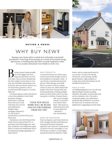 uying a house is quite possibly M OV E ST R A I G H T I N one of the biggest and most A frustration known too well to many important purchases you will who have previously bought a home is ever make. Once you have decided that the breakdown of a property chain – it the time is right to move home or even can often be a stressful and uncertain step onto the ladder and purchase your process. When buying a new build first home, like most house-hunters you there’s no need to wait for existing are faced with a question: to buy a owners to move out, which reduces the second-hand older property or a newly length of the house-buying chain and built one? the potential hassle of having multiple UK finance figures confirm that there’s parties involved. Better still, if you have a rise in the popularity of new build a property to sell first, Freeman Homes properties amongst offer a part exchange home buyers, showing scheme, so you don’t ‘YOUR NEW BUILD that in the year to June even need to find a 2018 there were 119,636 HOME WILL BE READY buyer. This means no new build homes AND FIT FOR PURPOSE chain whatsoever and bought using a no estate agent fees FROM DAY ONE’ mortgage compared to – definitely a 107,403 in the 12 win-win situation. months before, and 98,470 the year before that. M O R E F O R YO U R M O N E Y Furthermore, the 2018 National New Does moving into a new home fitted out Homes Survey reported that 90% of with a designer kitchen and bathrooms purchasers who had bought new, said featuring all the latest integrated they would buy a new build home again. appliances and ‘mod cons’ sound almost What is it about new build homes that is too good to be true? Amazingly, it’s not. becoming increasingly appealing to so New homes are built to a much higher many buyers? specification than the majority of older