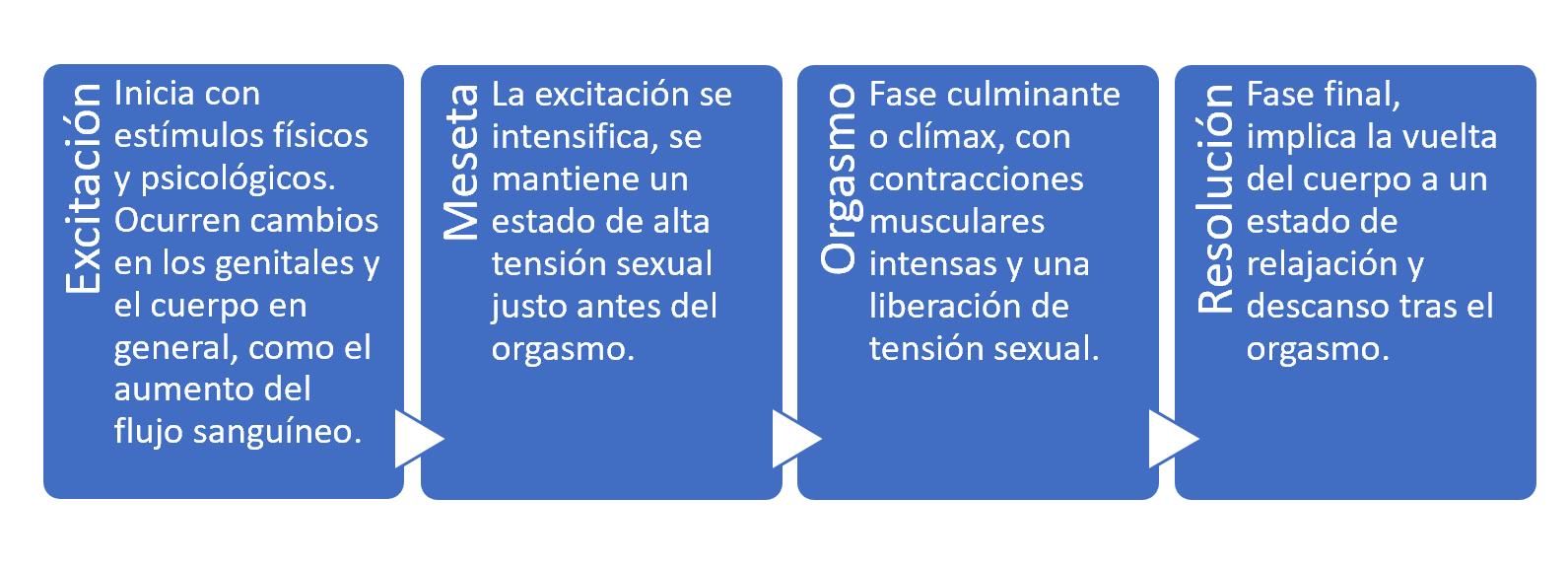 Según Masters y Johnson (1966), la respuesta sexual humana, esencialmente en función de los cambios fisiológicos que ocurren en el organismo, pasa por cuatro fases: fase de excitación, fase de meseta, fase orgásmica, y fase de resolución (Conceptum, 2022)