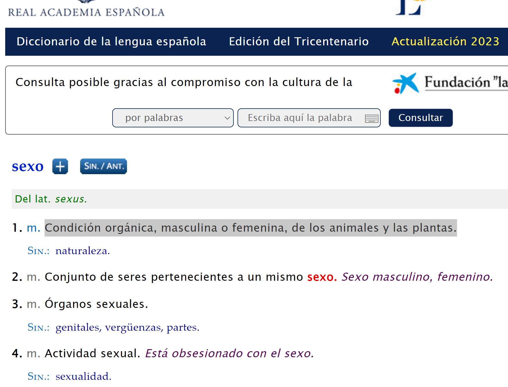 El Diccionario de la Real Academia Española ofrece cuatro acepciones para definir la palabra sexo La primera se refiere a la “condición orgánica, masculina o femenina, de los animales y las plantas”, en referencia a lo que llamaríamos el sexo biológico de un ser vivo