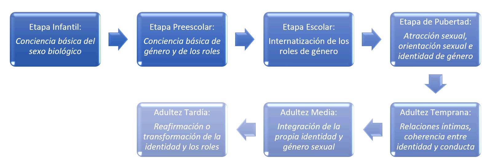 El desarrollo de la identidad sexual es un proceso que se extiende a lo largo de la vida, pues esa identidad es un proceso dinámico y entrelazado, desde las necesidades internas del ser humano, hasta los aspectos culturales que lo moldean. Este desarrollo de la identidad sexual abarca varias etapas, en las cuales los individuos exploran y consolidan aspectos de su sexualidad y su identidad de género. Dichas etapas no siempre son lineales y pueden variar en función de factores biológicos, psicológicos, sociales y culturales. A continuación se plantea un modelo descriptivo de las principales fases del desarrollo de la identidad sexual en 7 etapas (Clínica Universitaria Rey Juan Carlos, 2021, Govern Illes Balears, s/f; Wikipedia, 2024):