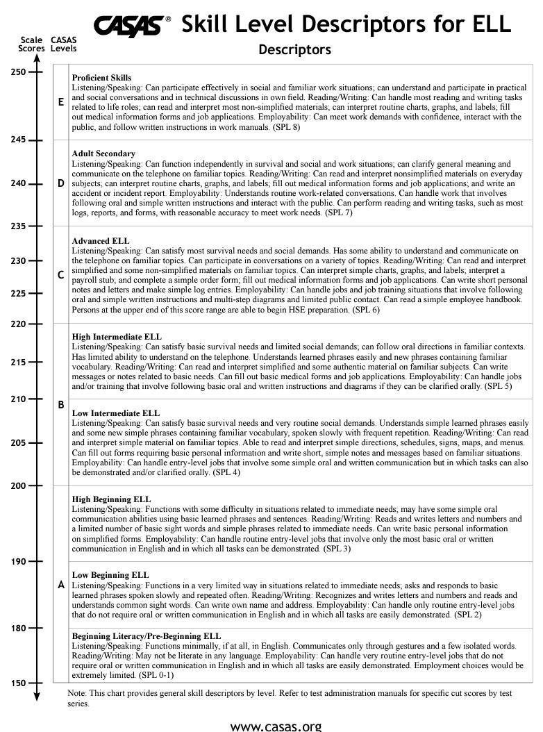 • All students enrolling in ESL, Diploma, or GED classes are required to take the CASAS assessment prior to starting classes. Some CTE classes may require students to take the CASAS as well. Students will be scheduled for an assessment appointment at the time of registration.