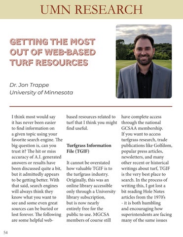 have complete access through the national GCSAA membership. If you want to access turfgrass research, trade publications like Golfdom, popular press articles, newsletters, and many other recent or historical writings about turf, TGIF is the very best place to search. In the process of writing this, I got lost a bit reading Hole Notes articles from the 1970’s - it is both humbling and encouraging how superintendents are facing many of the same issues