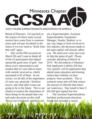 Board of Directors. Giving back to the origins of where some crucial monies have come from is common sense and will pay dividends in the future if we ever need to “drink from that well” again. • Day on the Hill occurred on March 9th and I want to thank all of the 42 participants that helped spread the good story of golf. Just about every representative and senator that we were able to meet with warmly received us, which amounted to 82 of them. In our circles, we all talk of the importance of water use, pesticide / fertilizer access, and what labor issues are going to be in the future. This is our chance to express the importance of these things to the people that vote and make decisions on this stuff. This is our livelihood, whether you