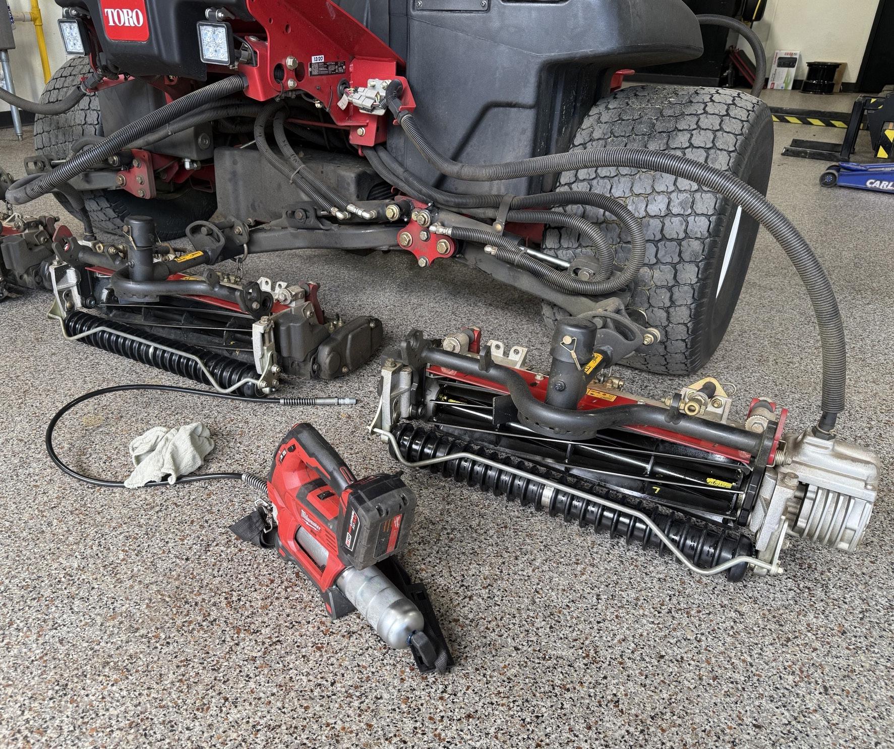 Removing the load creates clearance, allowing grease to flow evenly around the entire surface. Some areas where load should be removed before greasing include cutting unit lift arm pivots, lift cylinder pins, rear axle pivot pins, steering knuckle king-pins, steering fork bushings, and loader or backhoe pins. It may be more convenient to grease some of these points when a machine is on the hoist, but remember — they’re often still under load. For lift arms and cylinders, set the cutting units or attachments in “float” so they rest on the ground. For rear axle pivots and steering components, jack the machine by the frame to remove the load.