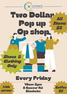 Check out the Pop Up Op Shop at 8 Beaver Road Blenheim every Friday! Come and get a bargain with all items just $2 each and Coffee just $5 each We have a play area for your little ones and plenty of seating. All money raised goes back into the Connect Marlborough Trust and funds our community programmes. You can donate quality clothing