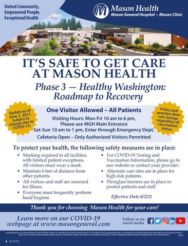 Learn more on our COVID-19 webpage at www.masongeneral.com www.MasonGeneral.com • 901 Mountain View Drive, Shelton, WA 98584 • (360) 426-1611, from Allyn (360) 275-8614, Toll free (855) 880-3201, TTY/TDD (360) 427-9593. Equal Opportunity Provider • Free Translation Services Provided/Se habla español • Mason Health does not discriminate on the basis of patient’s age, race, ethnicity, national origin, gender identity or expression, sexual orientation, religion, culture, physical or mental disability, financial status or condition (including the terminally ill or dying), limited English, visual, hearing or learning impaired. 06/2021