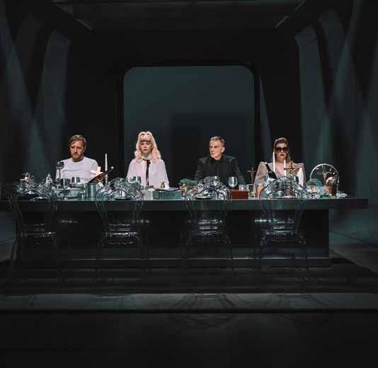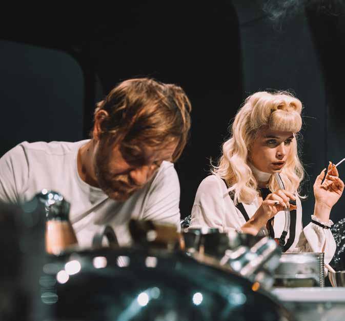Kostumografija Marine Sremac v predstavi Kazimir in Karolina gradi izrazito večplastno, ironično in vizualno nasičeno podobo sveta, ki deluje groteskno, karnevalsko, a hkrati prepoznavno in otipljivo stvarno. S premišljenim plastenjem tekstur, bleščic, umetnega krzna, retro krojev in neujemajočih se modnih kodov ustvarja polje, v katerem se razkrivajo razredne razlike, osebne krize in absurdi družbenega vzdušja. Kostumografsko celoto dopolnjujejo lasulje, ki učinkujejo kot hibrid med preobrazbo in masko, komični poudarek in orodje identitetne razgradnje, ob tem pa igralcem omogočajo drzno in večregistrsko igro.