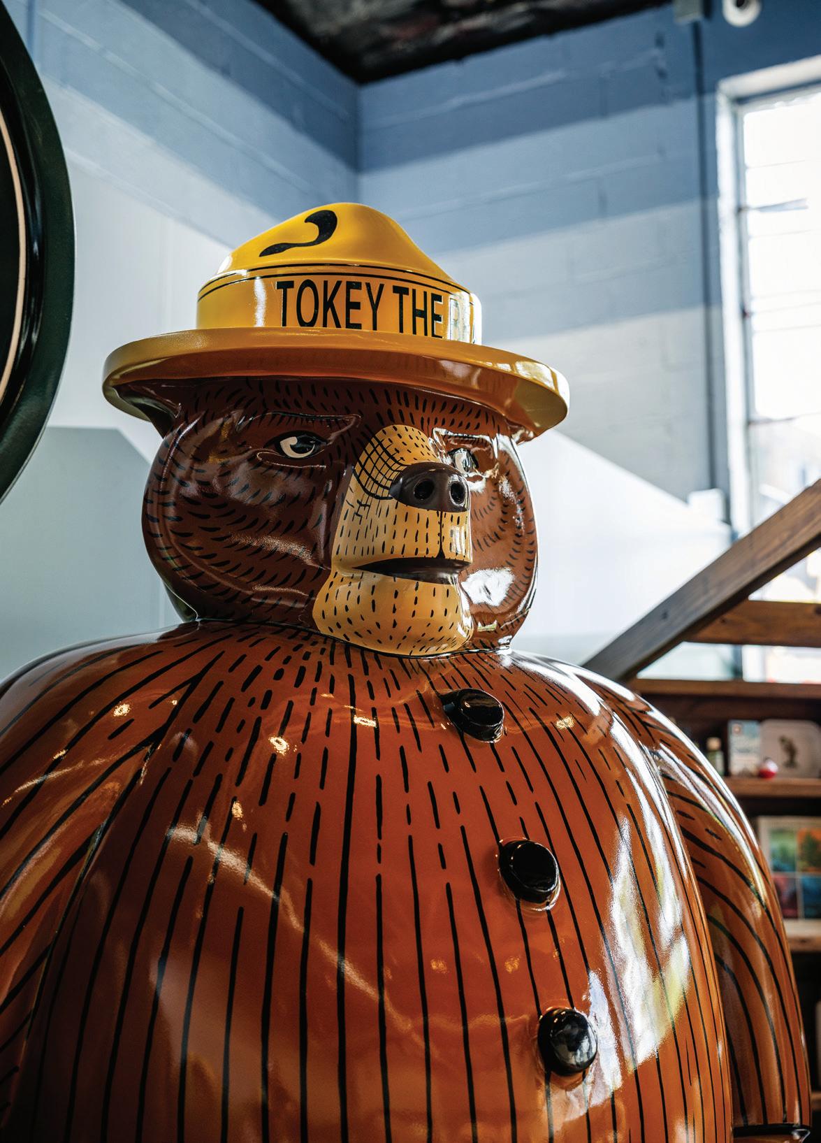 Boone Town Provisions in Boonton, New Jersey, riffs on a campsite theme—with a sense of humor. A bespoke ursine mannequin named Tokey the Bear catches customers’ eyes right away. Standing nine feet tall and holding a sign stating “Where there’s smoke, there’s fire,” Tokey lends a playful personality to the store. Wood and moss add amusement to display cases and lure shoppers to the merchandise.