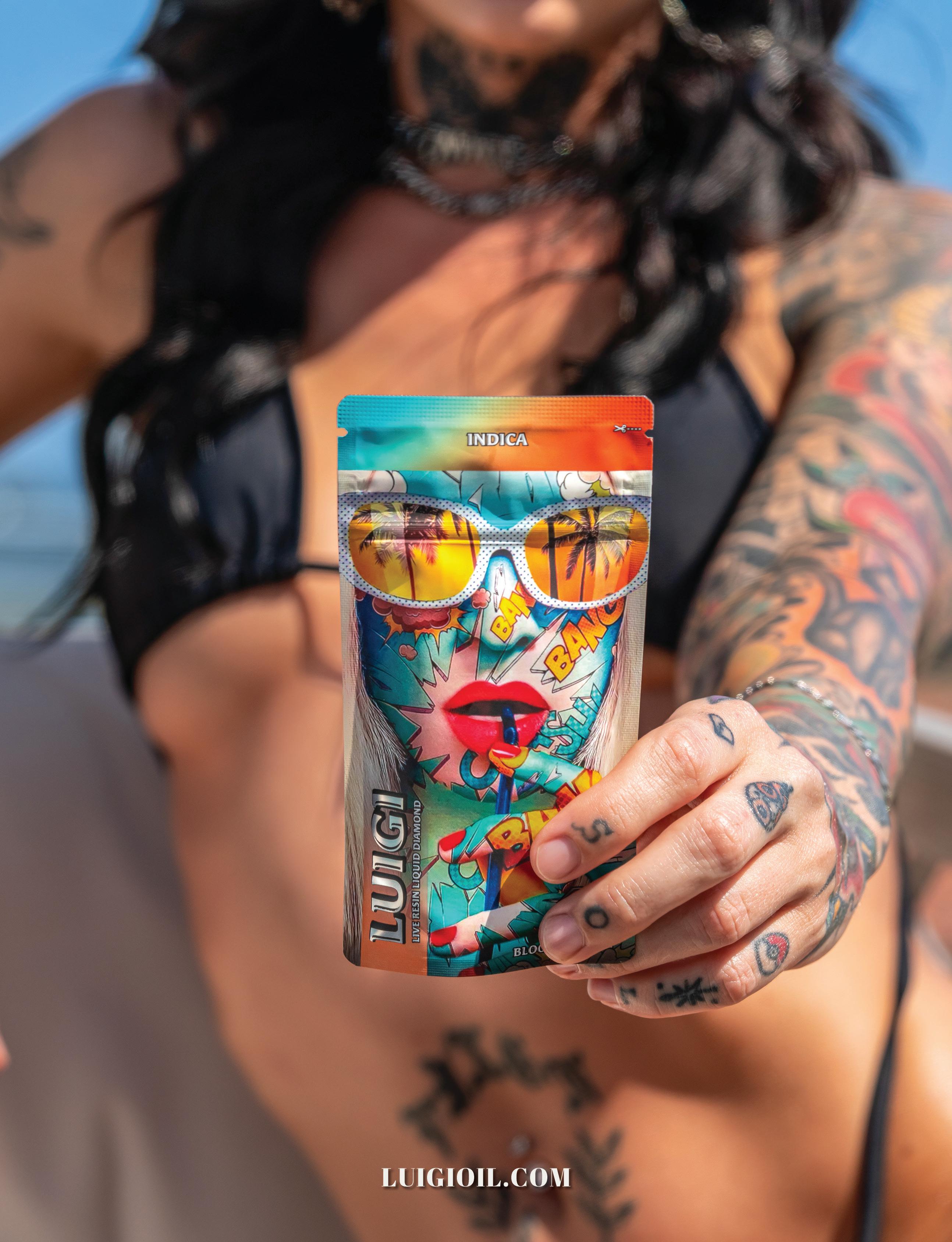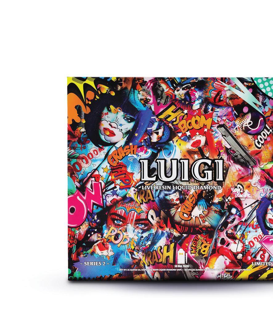 That attitude extends even to packaging. Luigi’s boxes, pouches, and pre-roll tubes are works of art. The “pop surrealism meets neo-pop comic” style of the imagery