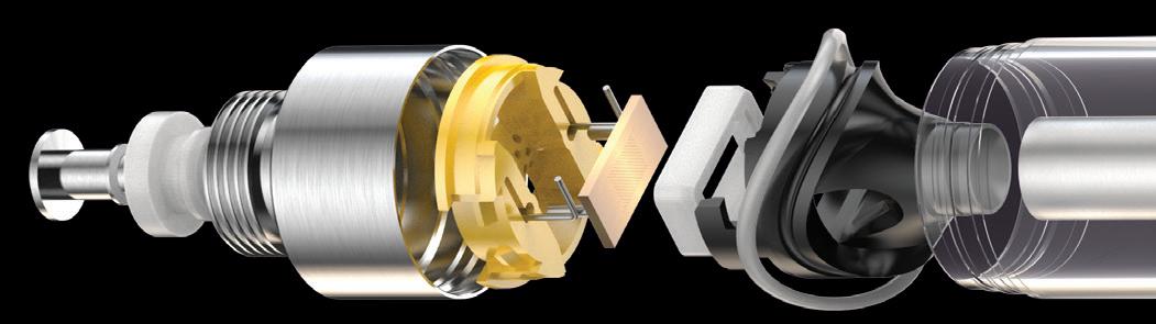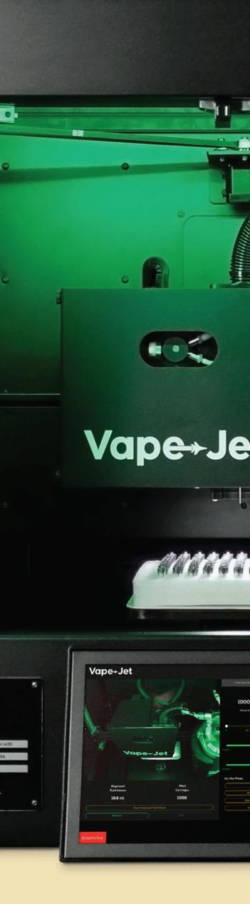 Founded in 2016 by brothers Corey and Dustin Koffler, Greentank Technologies is the only cannabis vape company with a Canadian federal research license allowing “oil-to-coil” testing on-site. “What distinguishes us in the industry is our ability to calibrate our products using actual cannabis extracts,” Chief Executive Officer Corey Koffler said. One of the fruits of Green Tank’s sophisticated end-to-end testing and research is the Quantum Chip™, a revolutionary heating technology that eschews traditional ceramic cores. Instead, the product uses thousands of microscopic holes to channel oil toward a heating layer, which instantly vaporizes the liquid. “Quantum Chip technology harnesses microfl uidics and capillary action,” Koffl er said. “Think of an ultra-modern pump that smoothly draws cannabis oil through the chip to a heating layer where it is converted into vapor.”