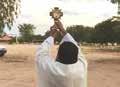 con falda y blusa “de las que llegan por donación”, y comienza la Fiesta del Día del Señor: canto de procesión de entrada, acompañados por la polifonía de un pueblo acostumbrado a comunicarse por la danza y el canto, y el ritmo de unas latas grandes y vacías de leche en polvo, cubiertas por un pedazo de plástico tensado con tiras de cámara de bicicleta. ¡Qué riqueza de encuentro! ¡Qué reverencia y fe profundas!