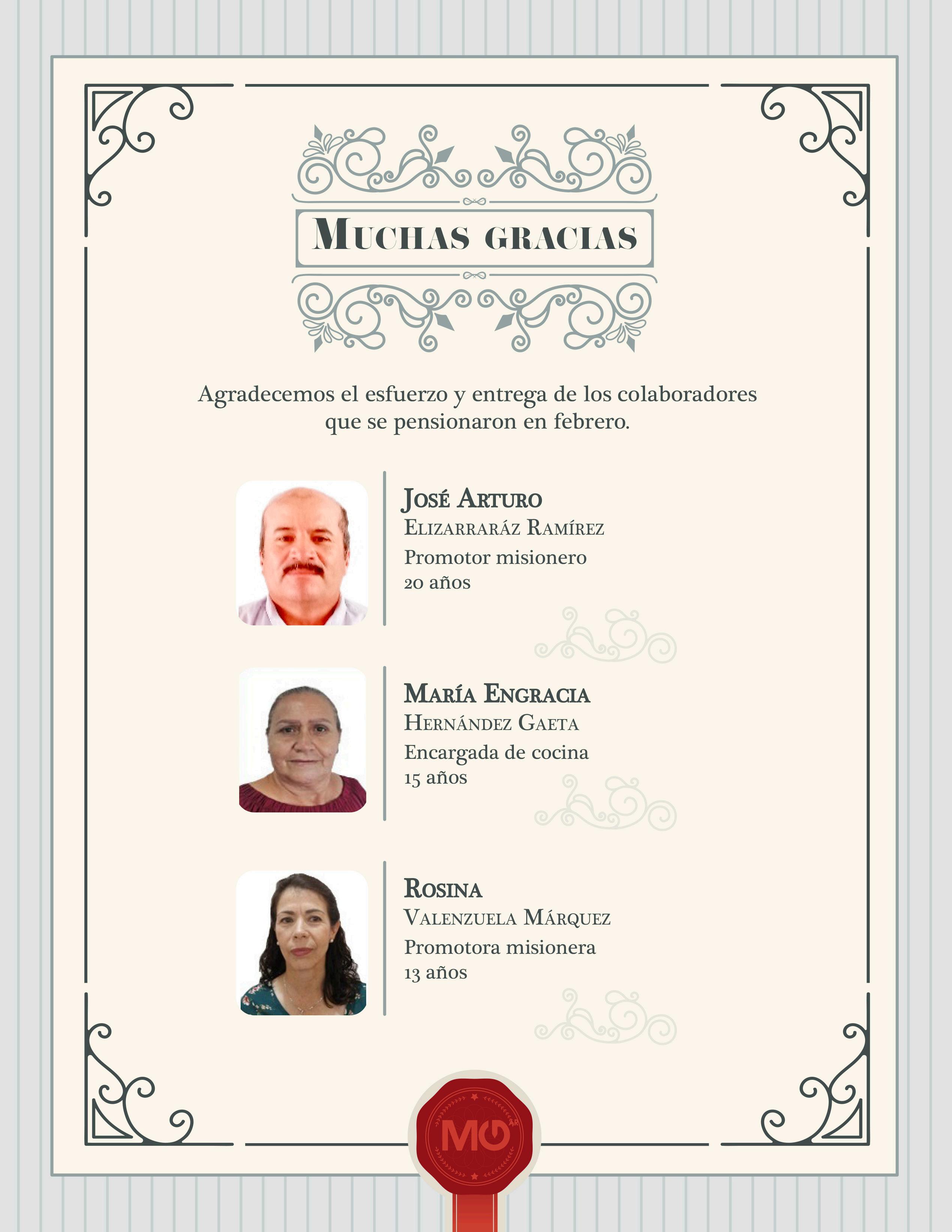 25. Que están en un lugar muy diferente a otras empresas porque todos tenemos algo que nos une, somos comprometidos, entregados, sin un interés (aunque es un medio de salir adelante económicamente), pero realmente se trabaja de corazón. Te das cuenta de que somos personas que tenemos mucho en común. Que sigamos estando unidos por la Misión, porque muchas veces no nos damos cuenta de que el pequeño esfuerzo que hacemos aquí llega muy lejos; todo suma y llega al lugar indicado.