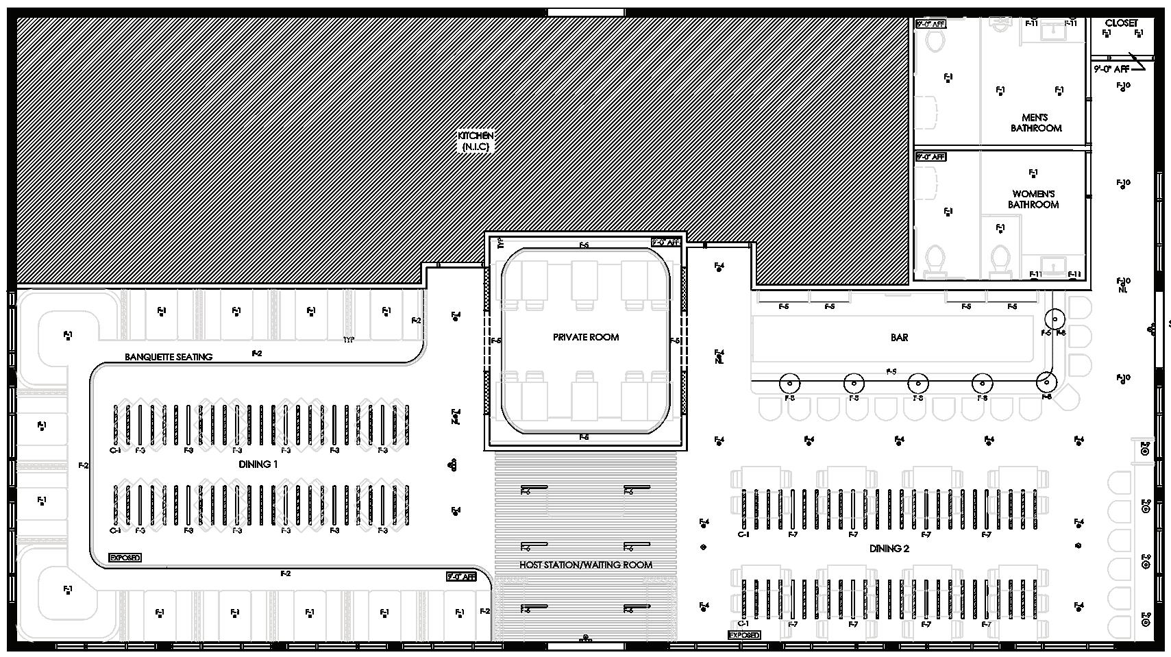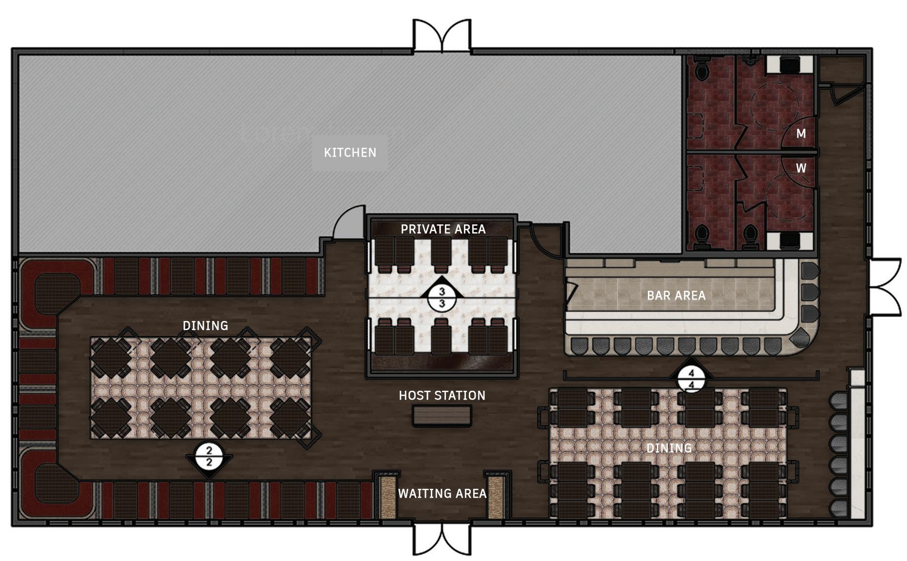 This 3,147-square-foot project is located in Chicago, IL, with a total seating capacity of 172. The layout includes 14 bar seats, 56 booth seats, 20 banquette seats, 72 seats at 2- and 4-top tables, 6 high-top seats, and 4 waiting area seats.