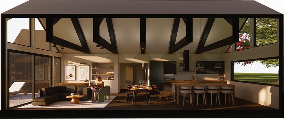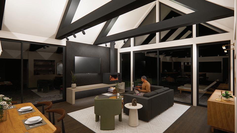The design process began in Autodesk AutoCAD, where the floor plan was developed and finalized. The completed plan was then imported into SketchUp to ensure precise measurements and accurate scaling. From there, the space was constructed from the ground up. Custom-modeled features include the kitchen island, cabinetry, ceiling element, and fireplace. Furniture selections and material finishes were sourced from SketchUp’s 3D Warehouse to enhance the realism of the model. Enscape was utilized to elevate the design with photorealistic materials, layered lighting, and carefully composed camera views. Final renderings were enhanced in Adobe Photoshop to ensure visual clarity and consistency across all images.
