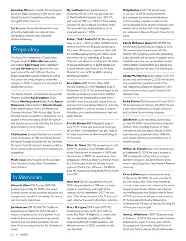 Philip Koplow (DMA ’76) passed away on January 18, 2018. During his lifetime as a composer, he wrote orchestral pieces commemorating tragedies of violence. His works, alongside those of other composers who wrote to honor the lives lost in war tragedies, are celebrated in Navona Records’ Peace for the Cities. Calista McKasson Kovin (BM ’00, MM ’02, Kondonassis) passed away on August 2, 2019. She was named principal harpist with the Tacoma (WA) Symphony soon after graduating, a post she held until her death. In addition to her classical career, she was passionately involved in the Scottish music tradition as a pianist and recording artist with her band, The McKassons. Donald W. Morrison (CIM Trustee 1979–94) passed away on November 2, 2018. He became vice president and general counsel of The Bell Telephone Company in Cleveland in 1974 and served on various nonprofit boards in the Cleveland area. André Previn (CIM International Council 2013– 19) passed away on February 28, 2019. He was a world-renowned pianist, arranger, conductor and four-time Oscar-winning composer. Jack Renner (audio recording) passed away on June 19, 2019. He was the former chairman, CEO and chief recording engineer of Telarc International, and was adjunct faculty in CIM’s audio recording department since 1986. His work yielded 23 Grammy nominations and 11 Grammy awards. William A. Tidwell (viola, Irvine) passed away on September 21, 2018. He was a student at CIM studying with Jeffrey Irvine, pursuing a bachelor’s degree in viola performance and a minor in psychology from Case Western Reserve University. Richard Weiner (percussion) passed away on December 30, 2018. He was a member of the CIM faculty since 1963, most recently as co-chair of percussion and co-head of the winds and percussion division. Weiner was inducted into the Percussive Arts Society’s Hall of Fame in 2018, and was principal percussion emeritus of The Cleveland Orchestra, following his retirement after 48 years of service, including 43 of those years as principal. Donna J. Welshhons (1967–70) passed away on February 15, 2019. She was an avid musician and played the organ for many years with the Congregational Community United Church of Christ and Trinity Lutheran Church, Monroeville.