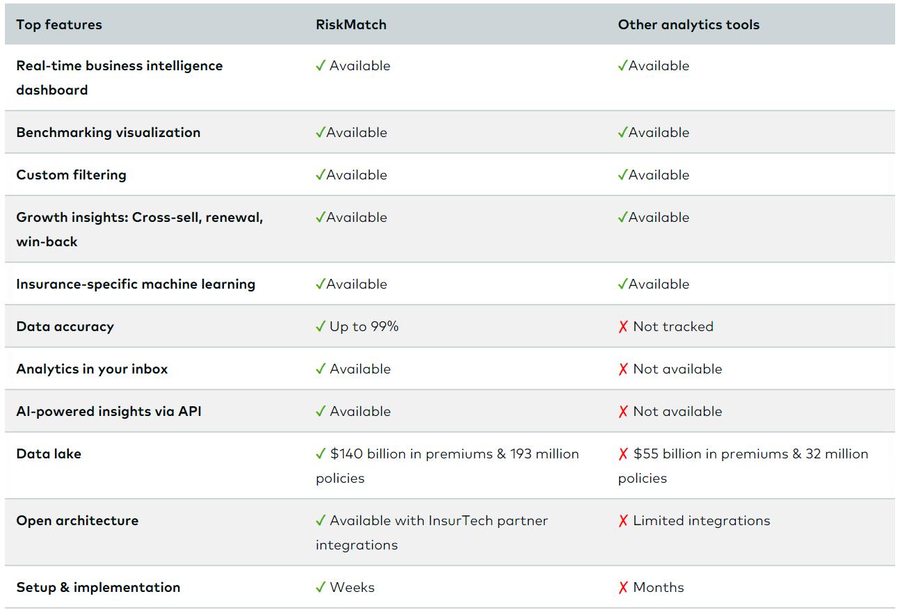 RiskMatch™ is an AI-powered insurance intelligence solution that provides you with the data-driven insights you need to grow your business and stay competitive in an increasingly complex industry. RiskMatch provides tools and resources to expand relationships with insurers, accelerate solution development capabilities, and drive efficiency in insurance placement transactions.