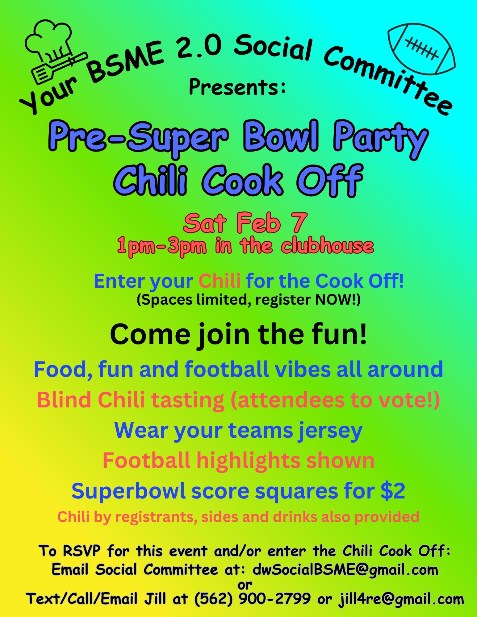 Pre-Super Bowl Party Chili Cook Off! Saturday Feb. 7 from 1pm– 3pm in The Clubhouse. Space is Limited! RSVP and Register to enter the Chili Cook Off now! Wear your team jerseys and join us for food, fun and football vibes! RSVP by text/call to Jill 562-900-2799 or email dwSocialBSME@gmail.com or jill4re@gmail.com
