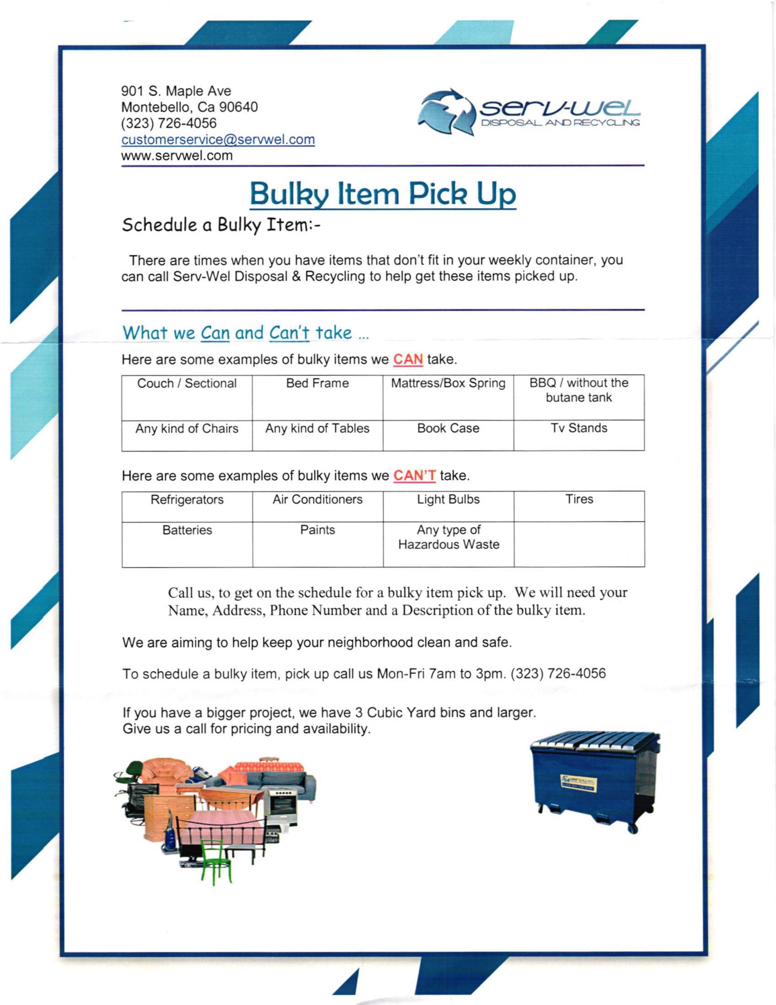 No Bulk Items (e.g. tires, carpets, mattresses, furniture).